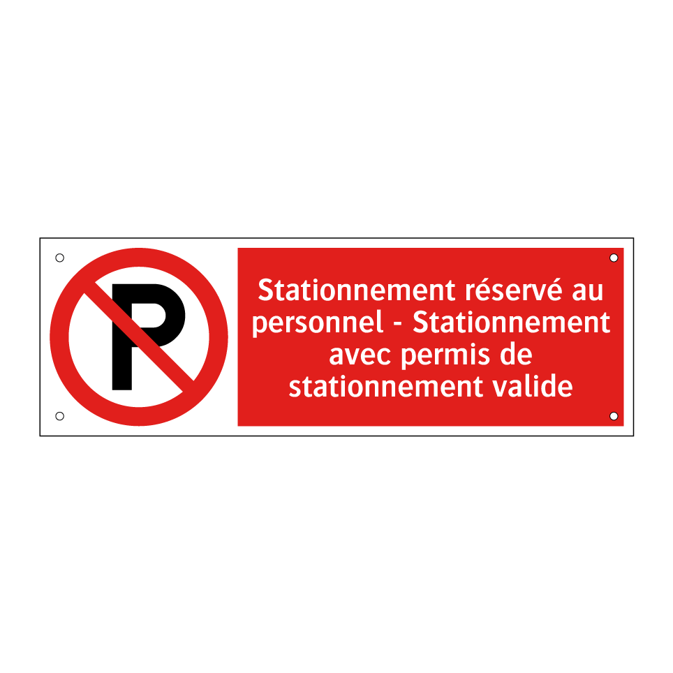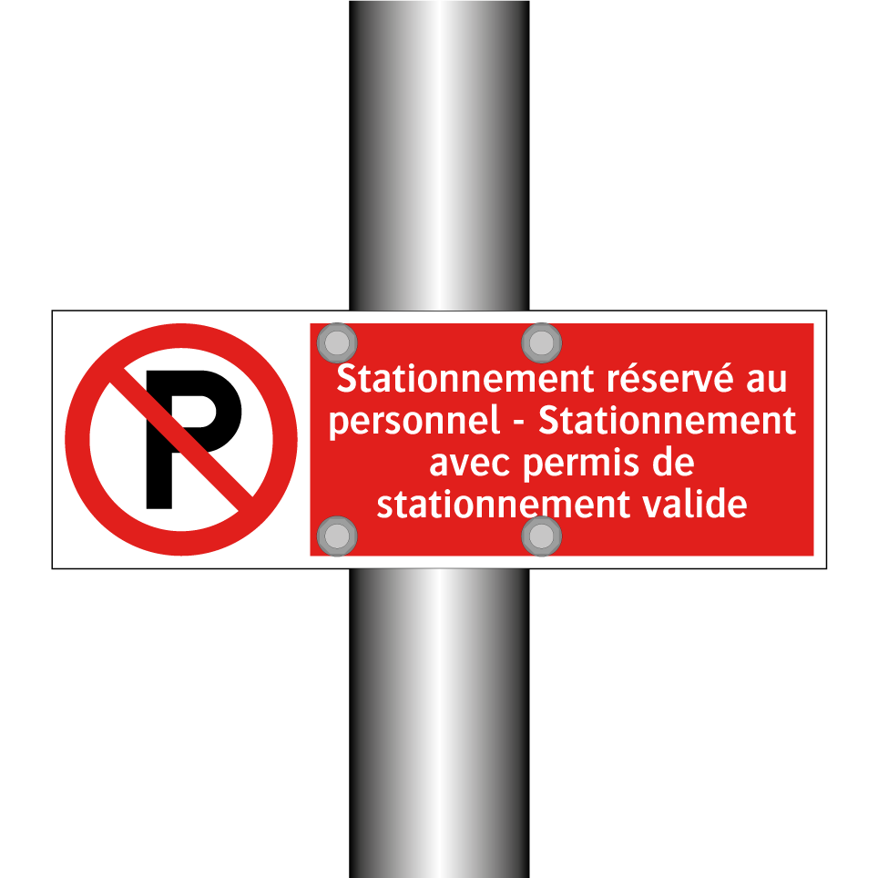 Panneau d'interdiction avec le texte : "Stationnement réservé au personnel - Stationnement avec permis de stationnement valide" et une symbolique claire.