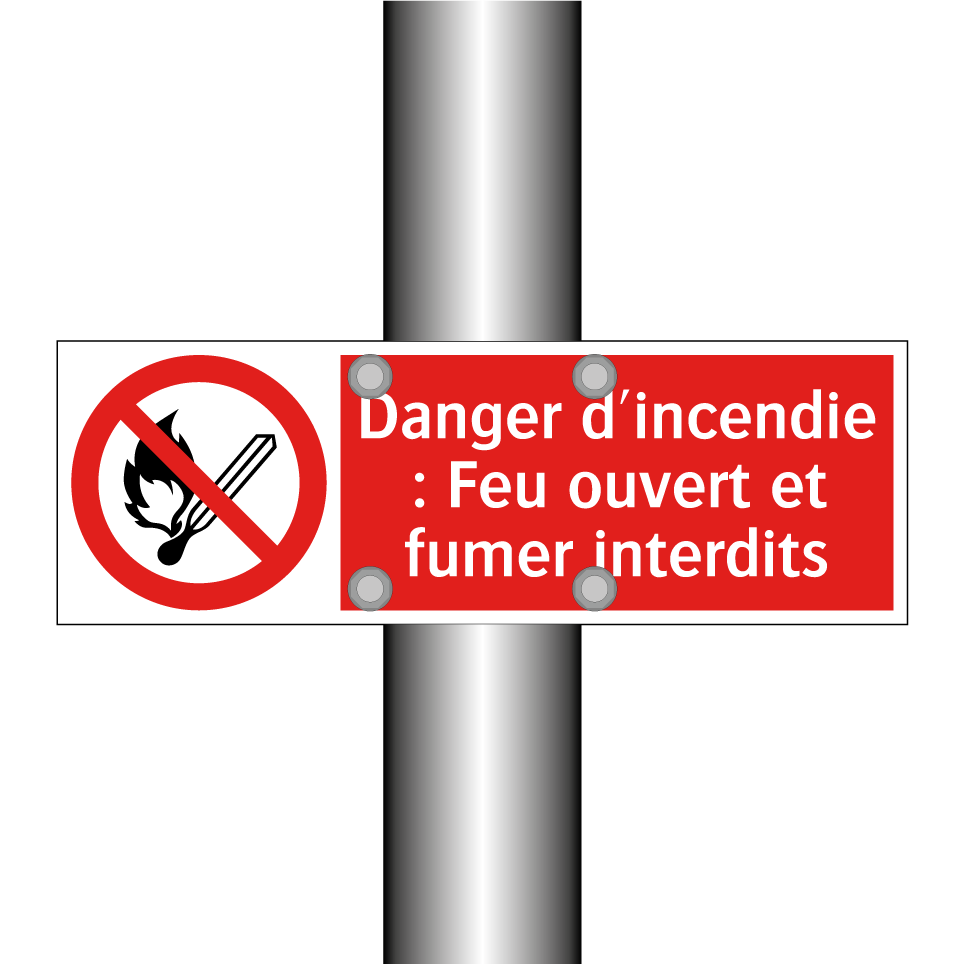 Panneau d'interdiction avec le texte : "Danger d'incendie : Feu ouvert et fumer interdits" et une symbolique claire.