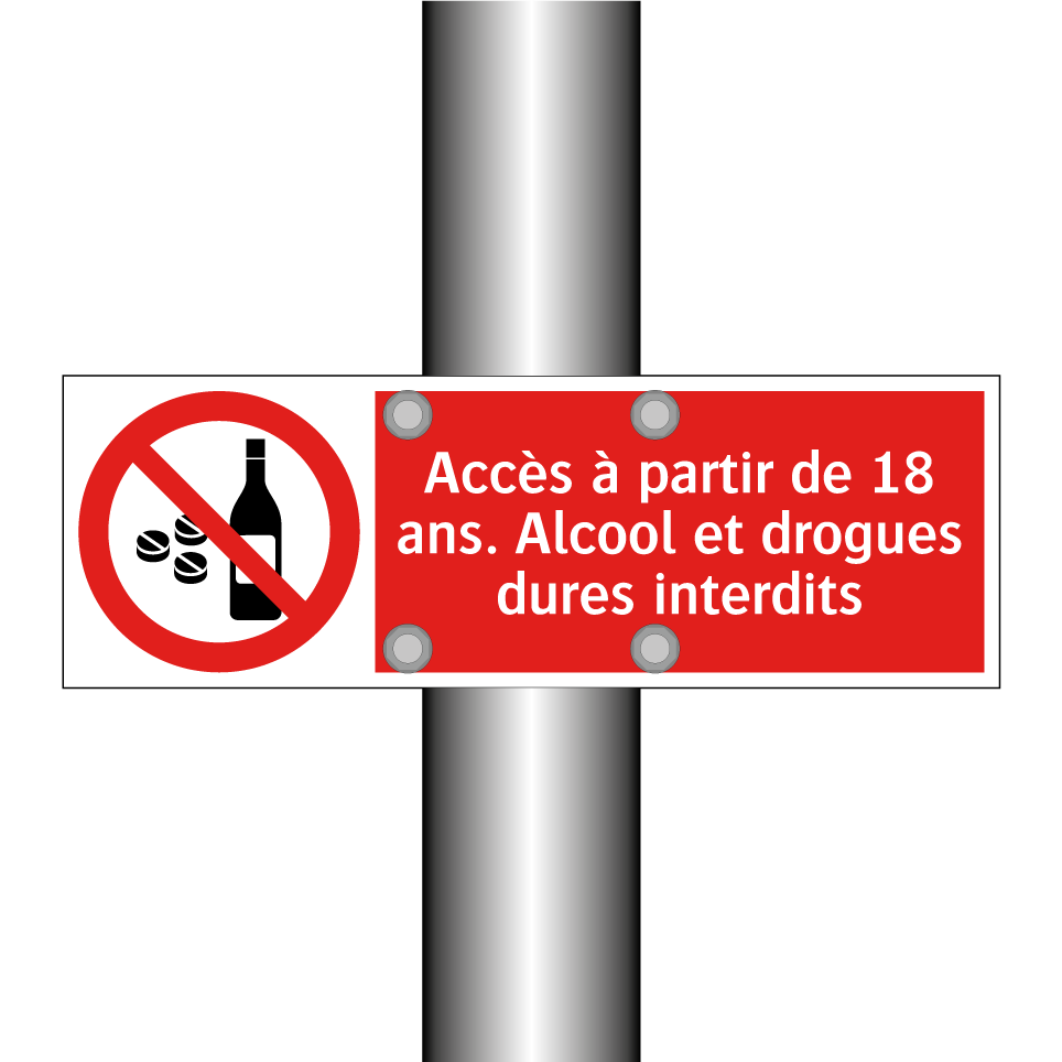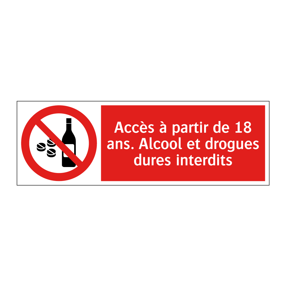 Panneau d'interdiction avec le texte : "Accès à partir de 18 ans. Alcool et drogues dures interdits" et une symbolique claire.