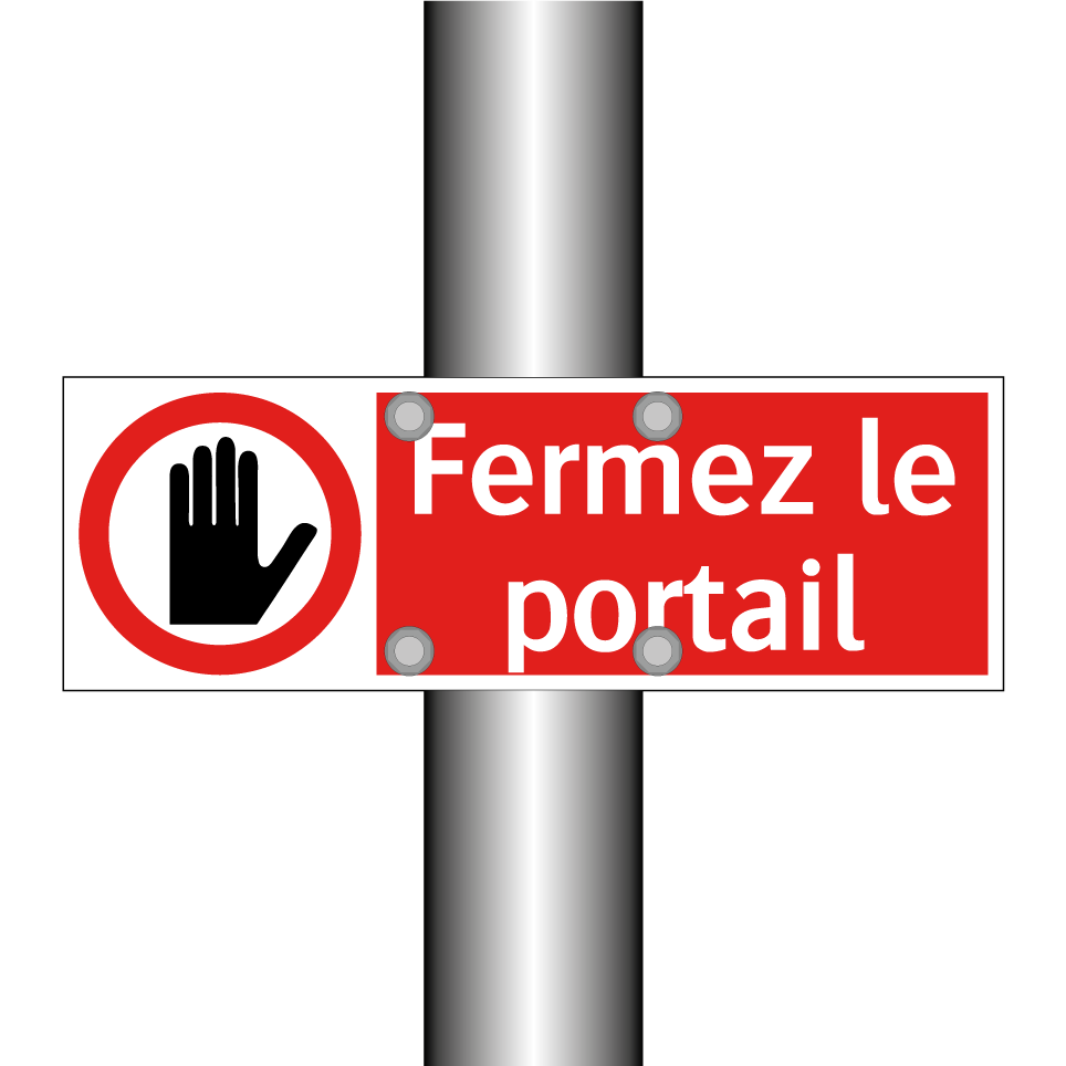 Panneau d'interdiction avec le texte : "Fermez le portail" et une symbolique claire.