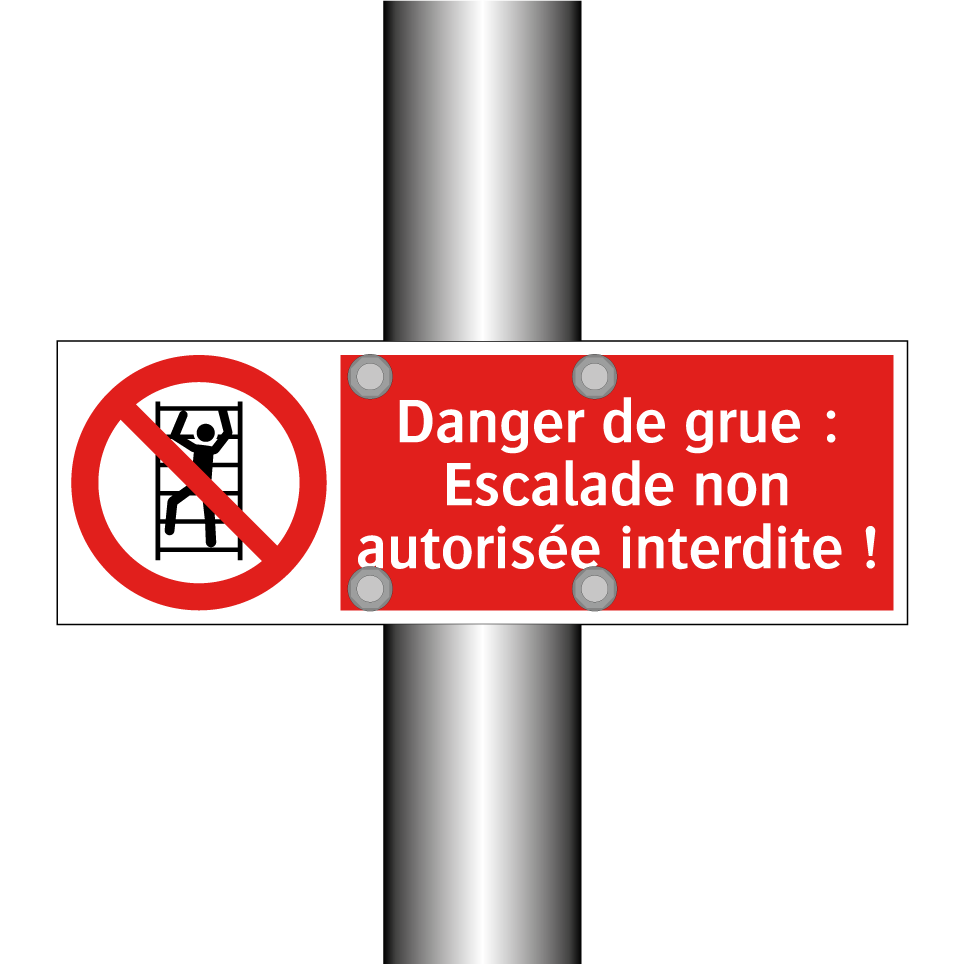 Panneau d'interdiction avec le texte : "Danger de grue : Escalade non autorisée interdite !" et une symbolique claire.