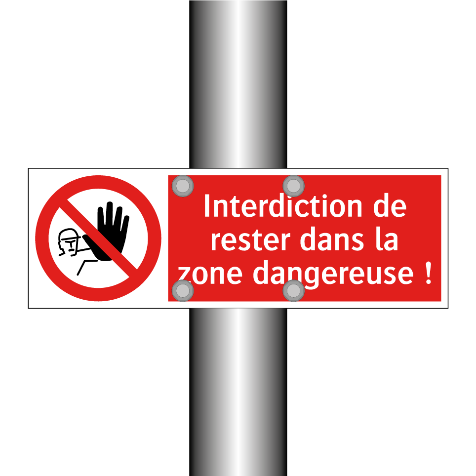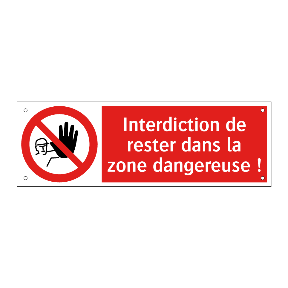 Panneau d'interdiction avec le texte : "Interdiction de rester dans la zone dangereuse !" et une symbolique claire.