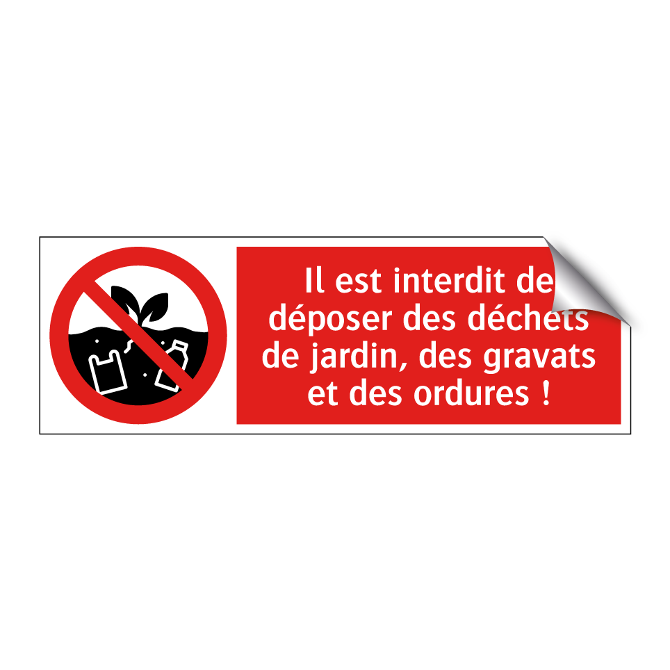 Panneau d'interdiction avec le texte : "Il est interdit de déposer des déchets de jardin, des gravats et des ordures !" et une symbolique claire.
