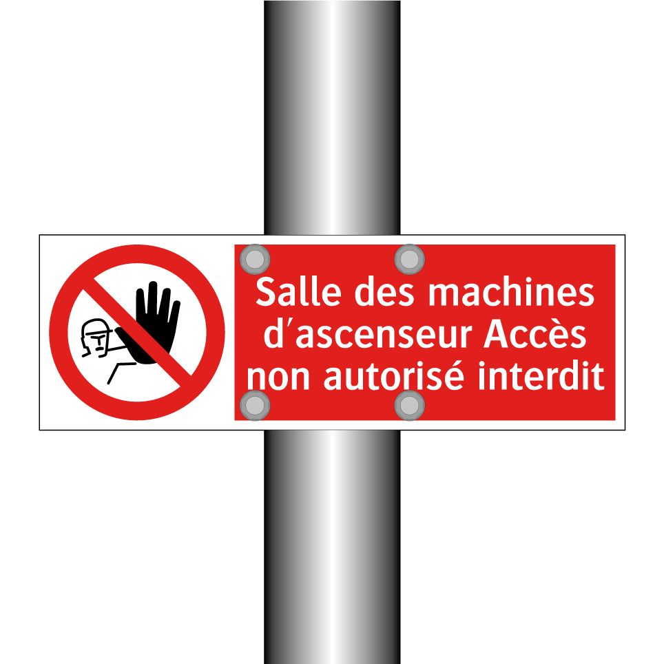 Panneau d'interdiction avec le texte : "Salle des machines d'ascenseur Accès non autorisé interdit" et une symbolique claire.
