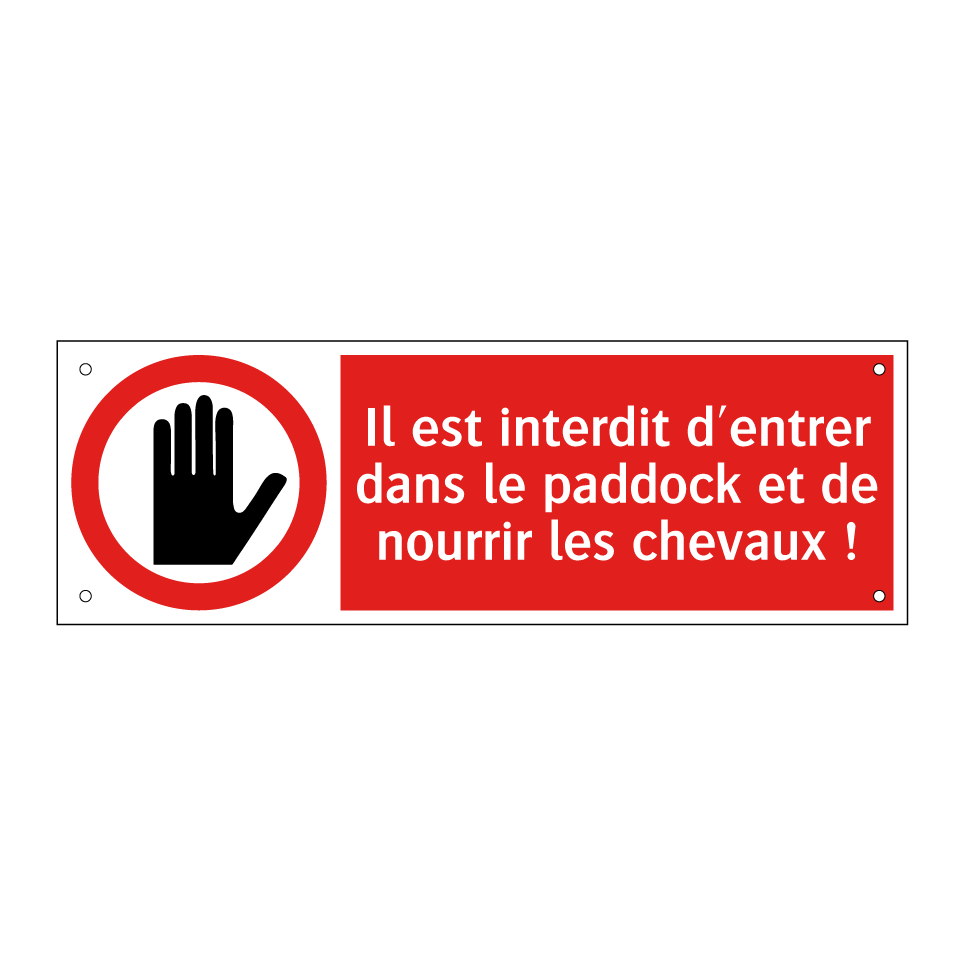 Panneau d'interdiction avec le texte : "Il est interdit d'entrer dans le paddock et de nourrir les chevaux !" et une symbolique claire.