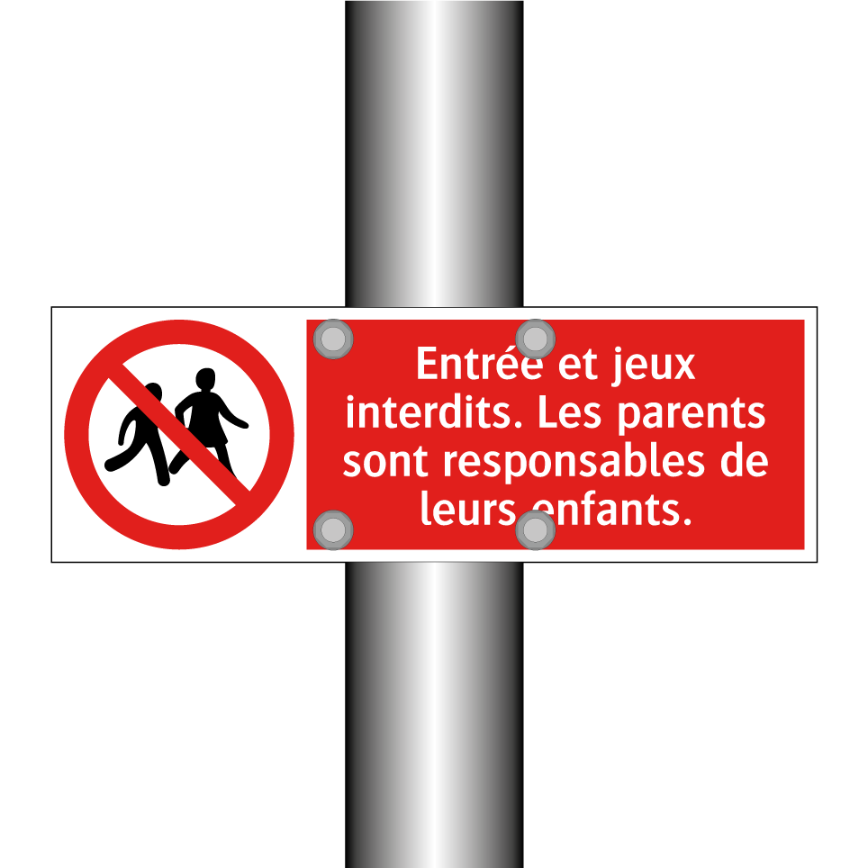 Panneau d'interdiction avec le texte : "Entrée et jeux interdits. Les parents sont responsables de leurs enfants." et une symbolique claire.
