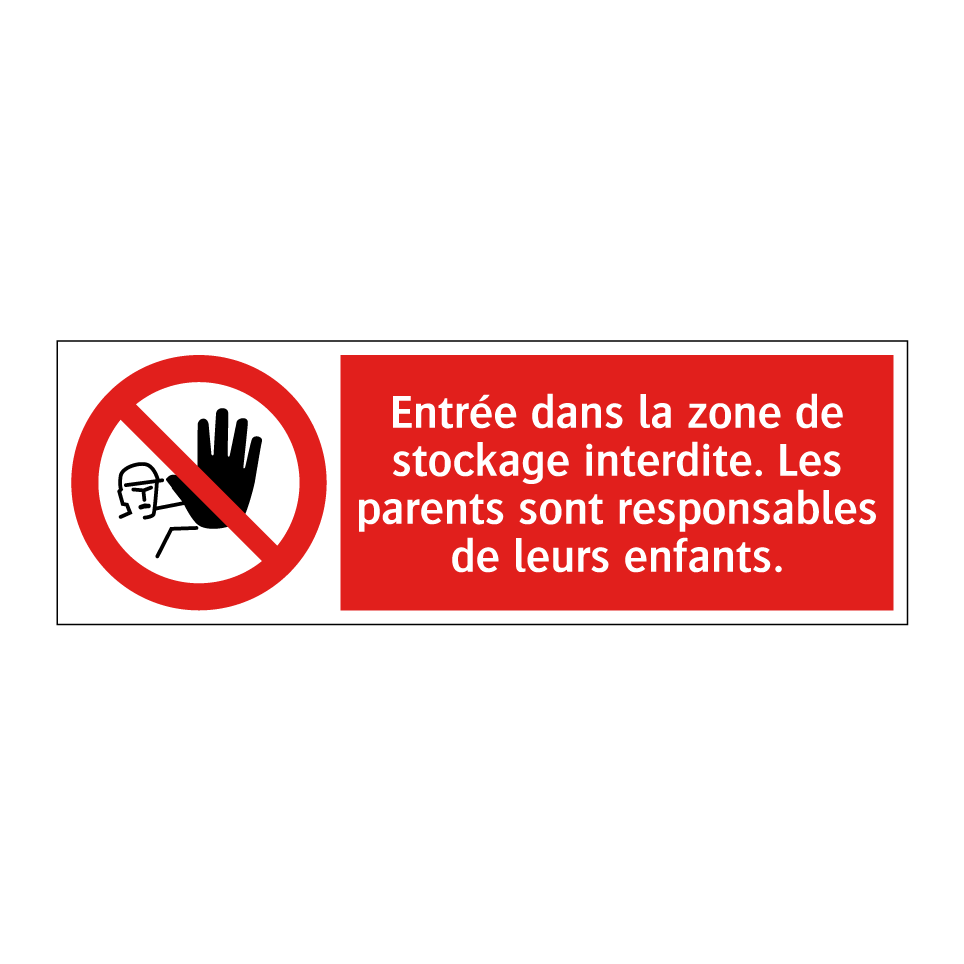 Panneau d'interdiction avec le texte : "Entrée dans la zone de stockage interdite. Les parents sont responsables de leurs enfants." et une symbolique claire.