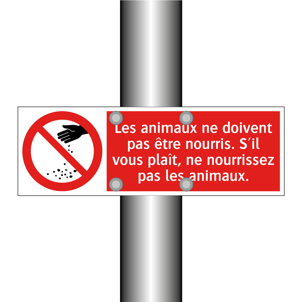 Panneau d'interdiction avec le texte : "Les animaux ne doivent pas être nourris. S'il vous plaît, ne nourrissez pas les animaux." et une symbolique claire.