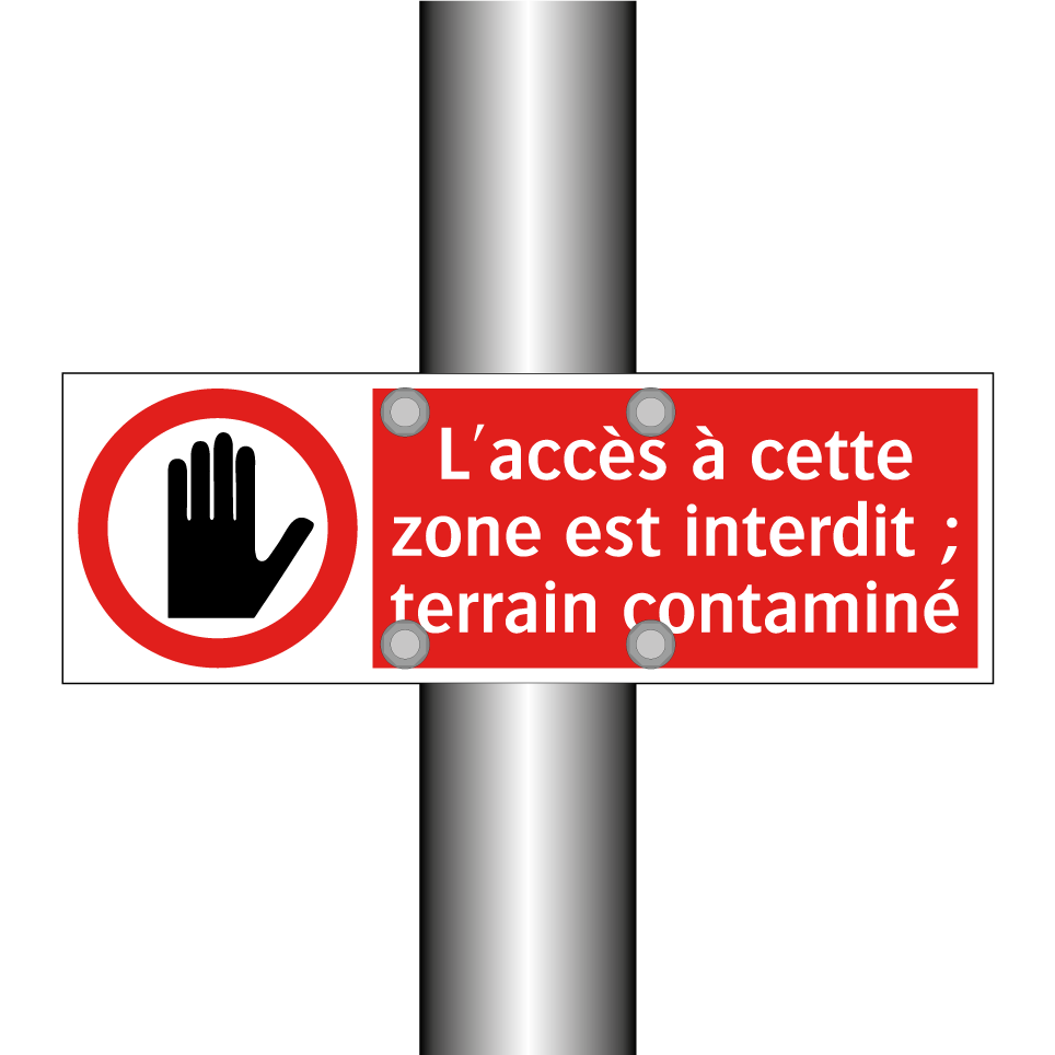 Panneau d'interdiction avec le texte : "L'accès à cette zone est interdit ; terrain contaminé" et une symbolique claire.