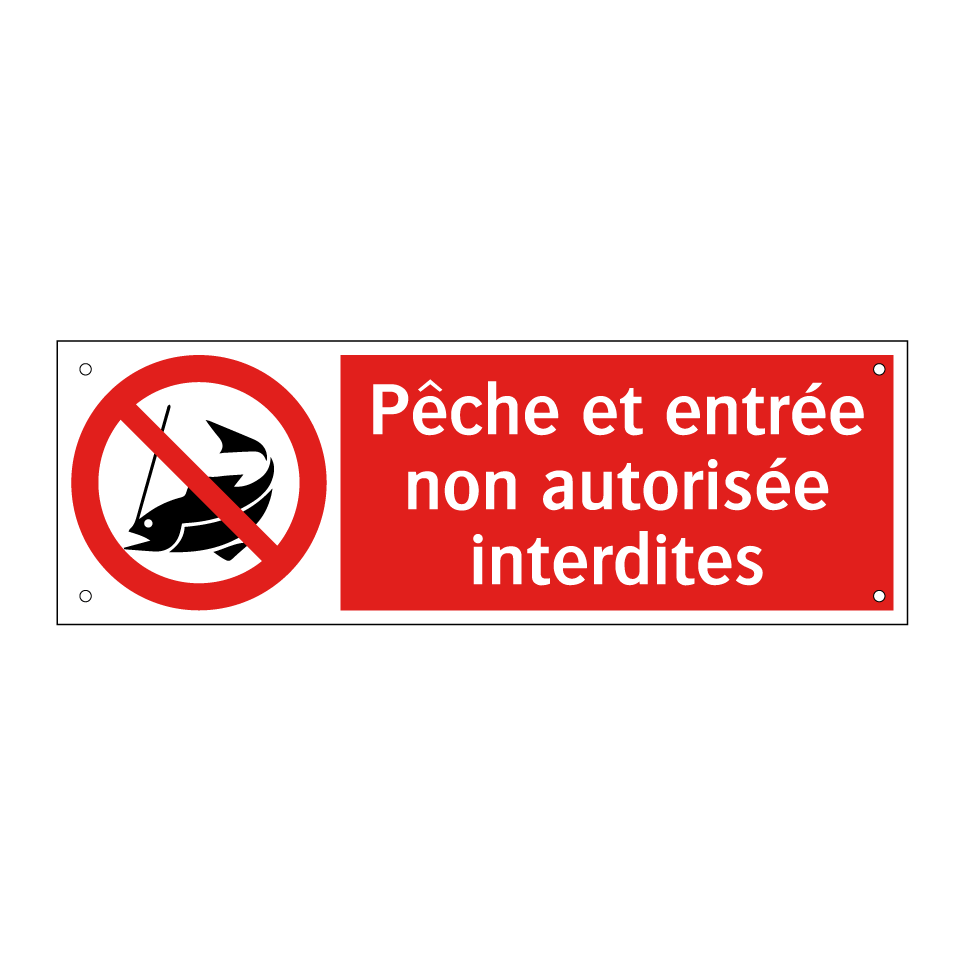 Panneau d'interdiction avec le texte : "Pêche et entrée non autorisée interdites" et une symbolique claire.