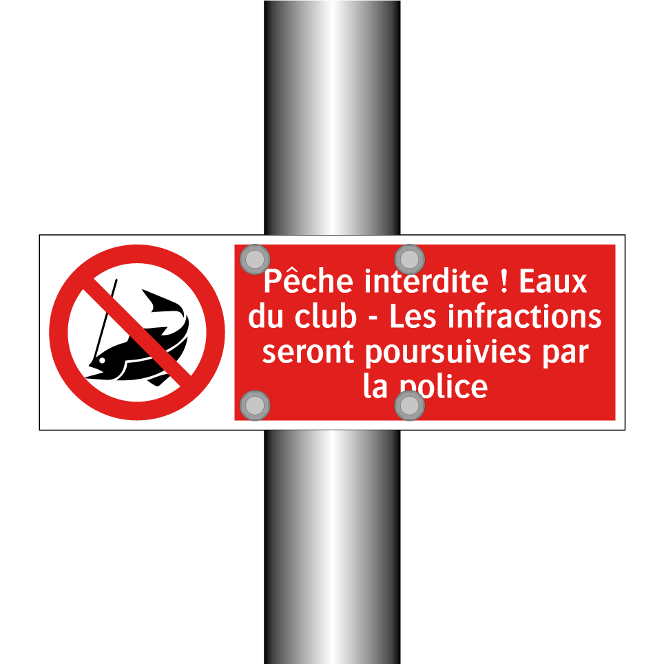 Panneau d'interdiction avec le texte : "Pêche interdite ! Eaux du club - Les infractions seront poursuivies par la police" et une symbolique claire.