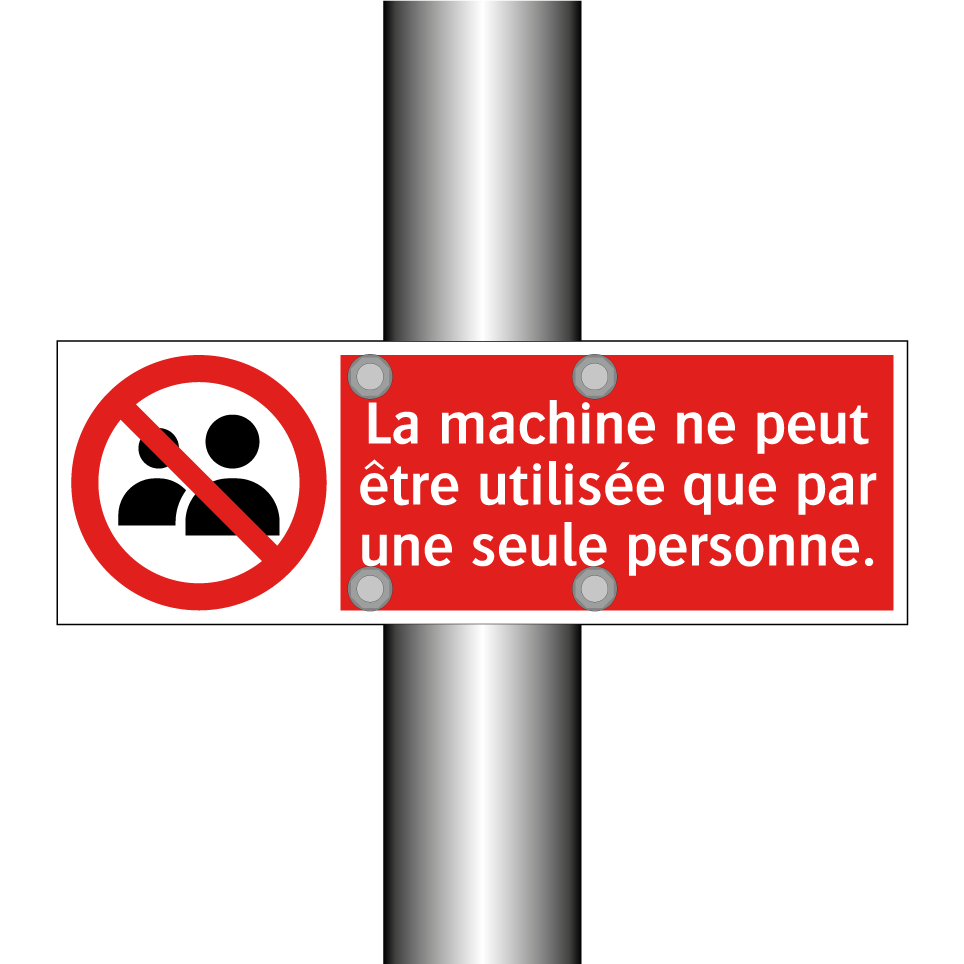 Panneau d'interdiction avec le texte : "La machine ne peut être utilisée que par une seule personne." et une symbolique claire.