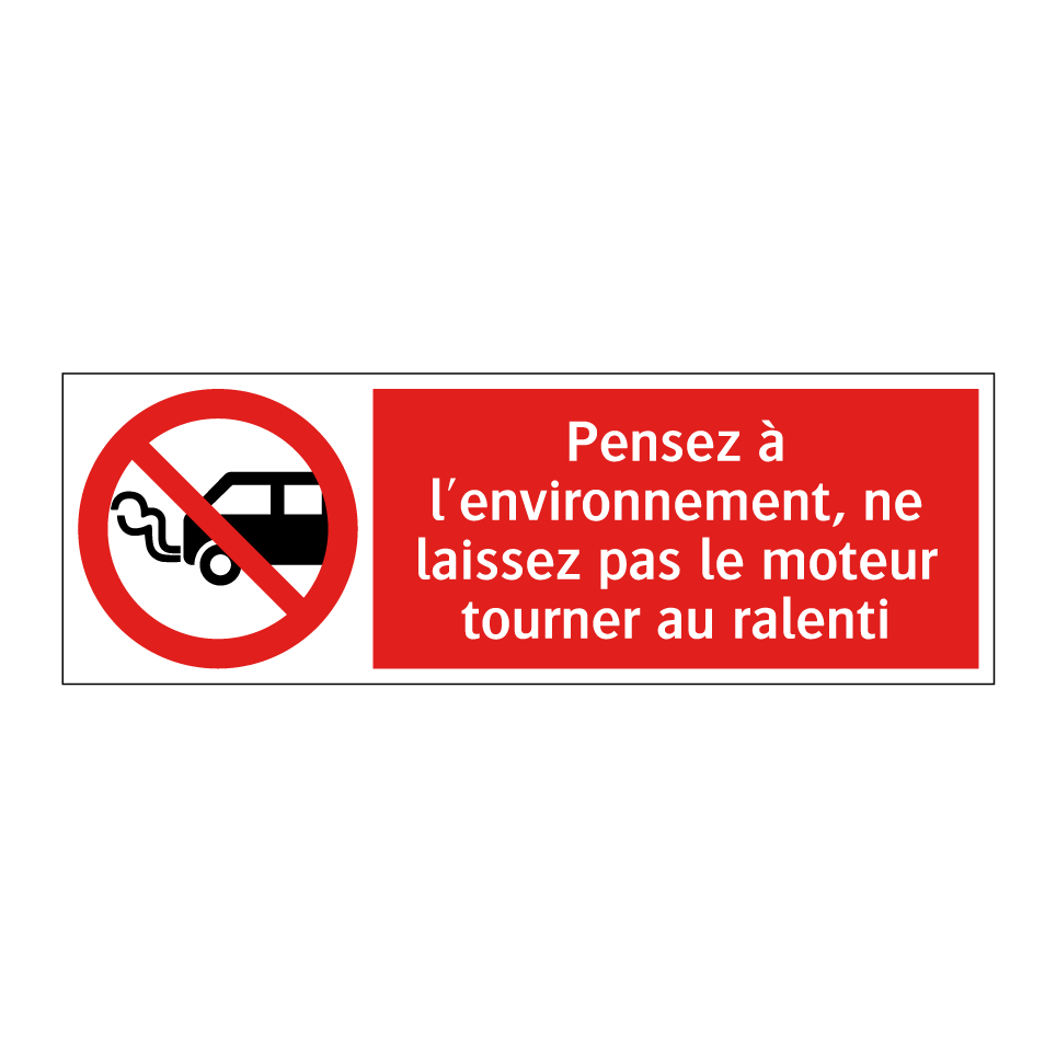 Panneau d'interdiction avec le texte : "Pensez à l'environnement, ne laissez pas le moteur tourner au ralenti" et une symbolique claire.