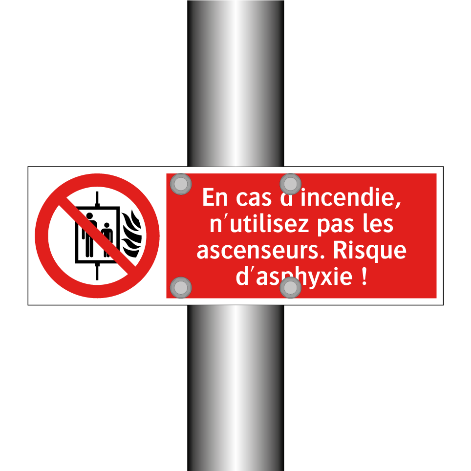 Panneau d'interdiction avec le texte : "En cas d'incendie, n'utilisez pas les ascenseurs. Risque d'asphyxie !" et une symbolique claire.