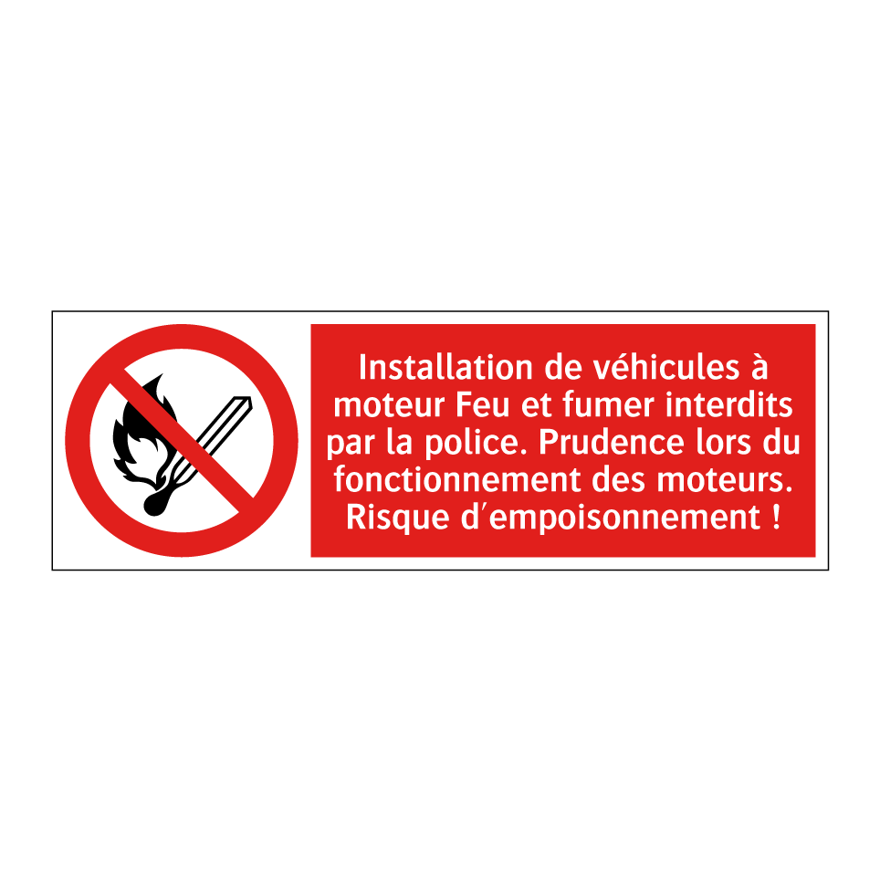 Panneau d'interdiction avec le texte : "Installation de véhicules à moteur Feu et fumer interdits par la police. Prudence lors du fonctionnement des moteurs. Risque d'empoisonnement !" et une symbolique claire.