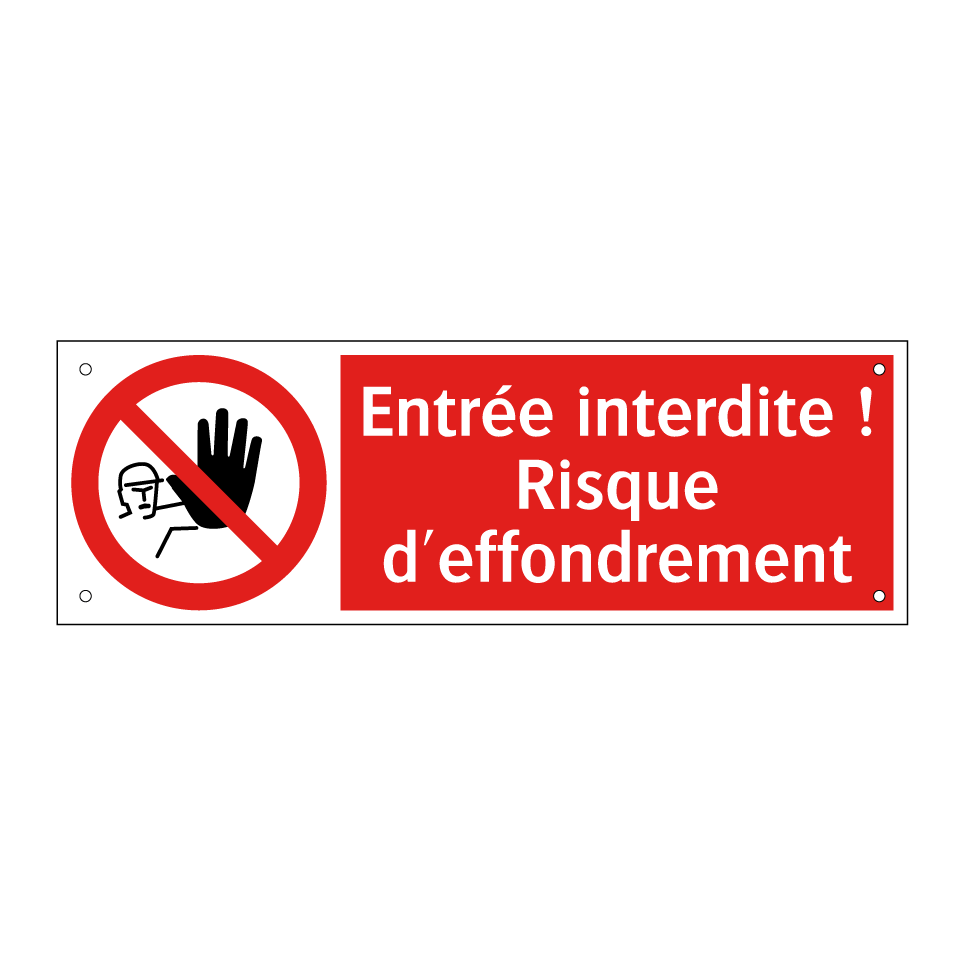 Panneau d'interdiction avec le texte : "Entrée interdite ! Risque d'effondrement" et une symbolique claire.