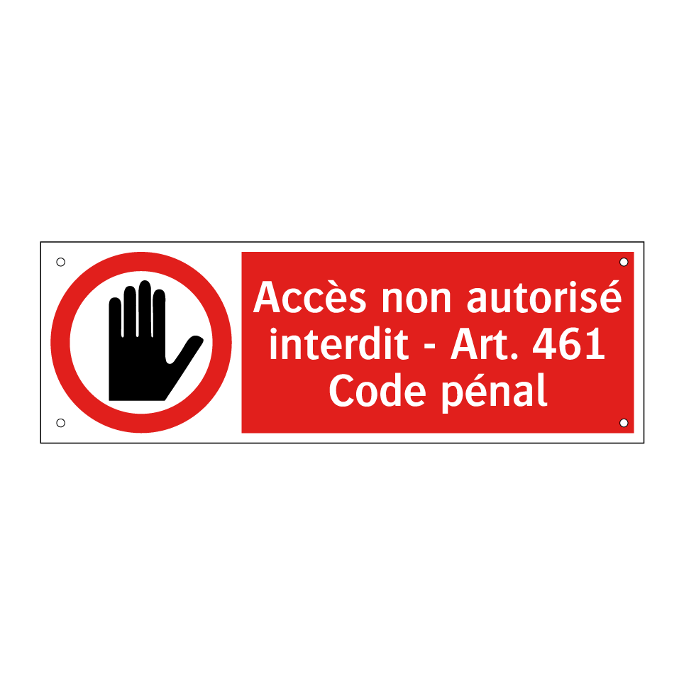 Panneau d'interdiction avec le texte : "Accès non autorisé interdit - Art. 461 Code pénal" et une symbolique claire.