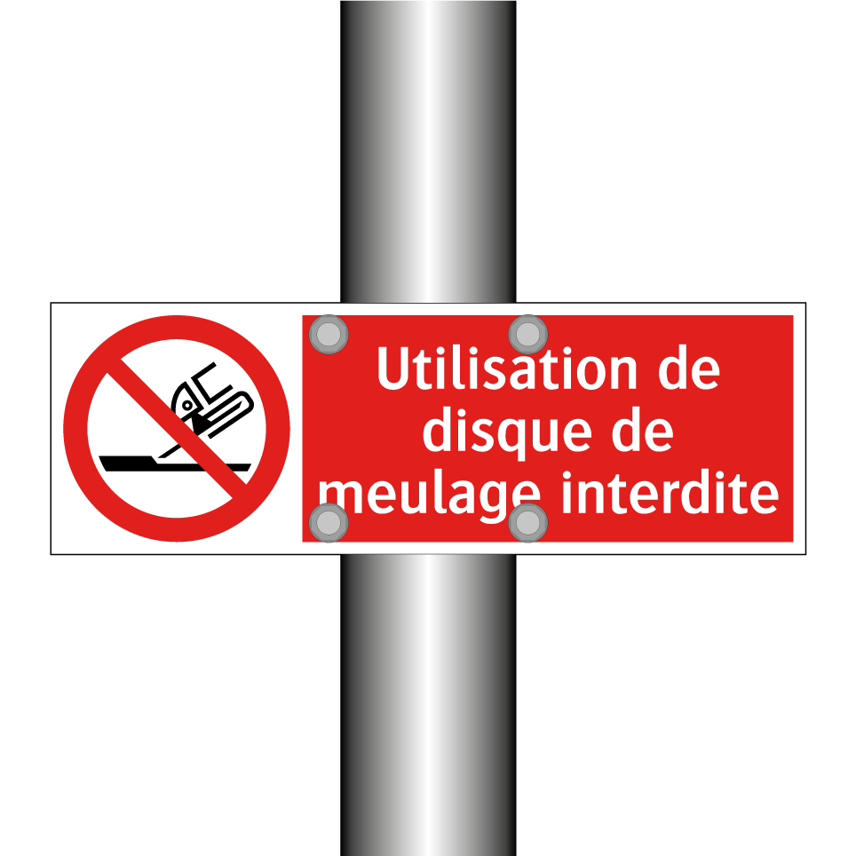 Panneau d'interdiction avec le texte : "Utilisation de disque de meulage interdite" et une symbolique claire.