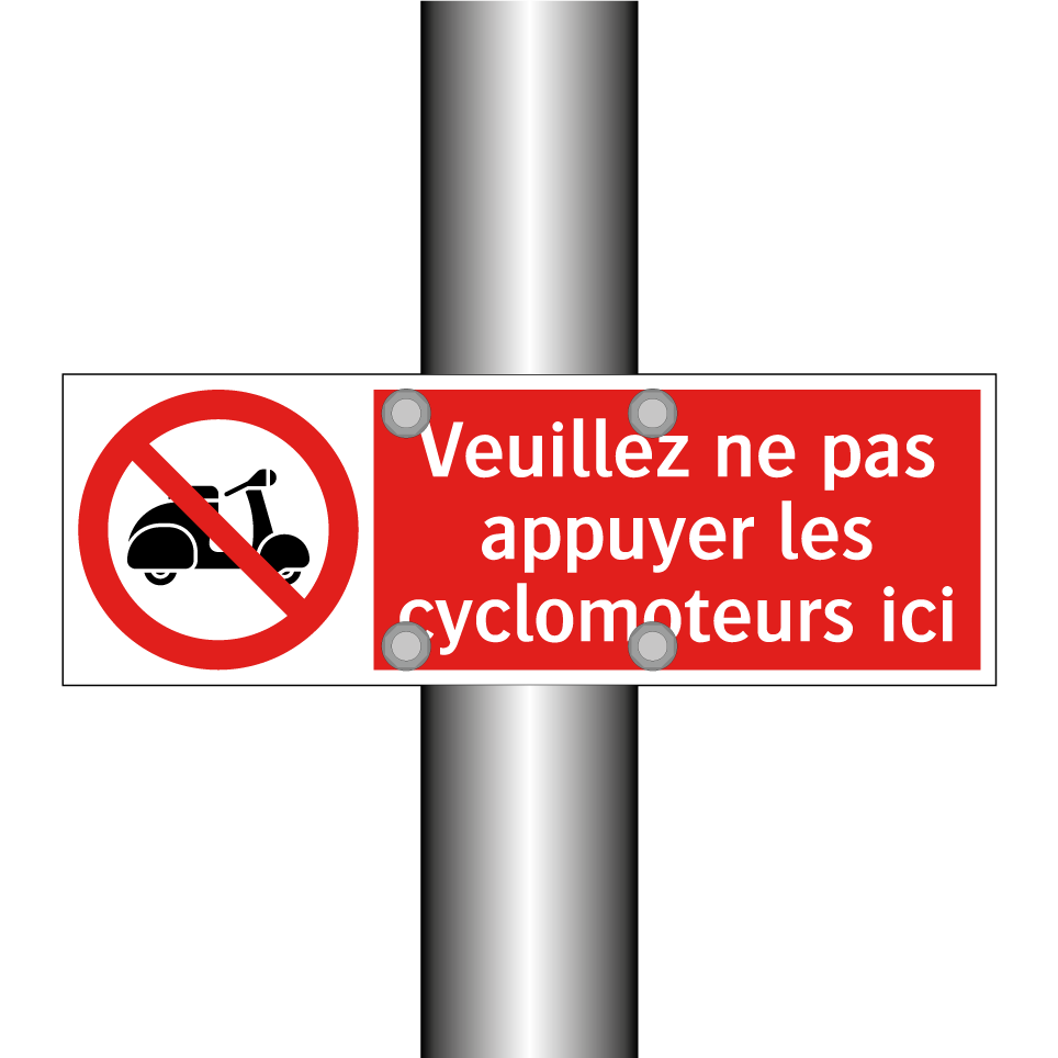Panneau d'interdiction avec le texte : "Veuillez ne pas appuyer les cyclomoteurs ici" et une symbolique claire.