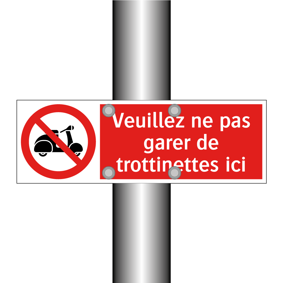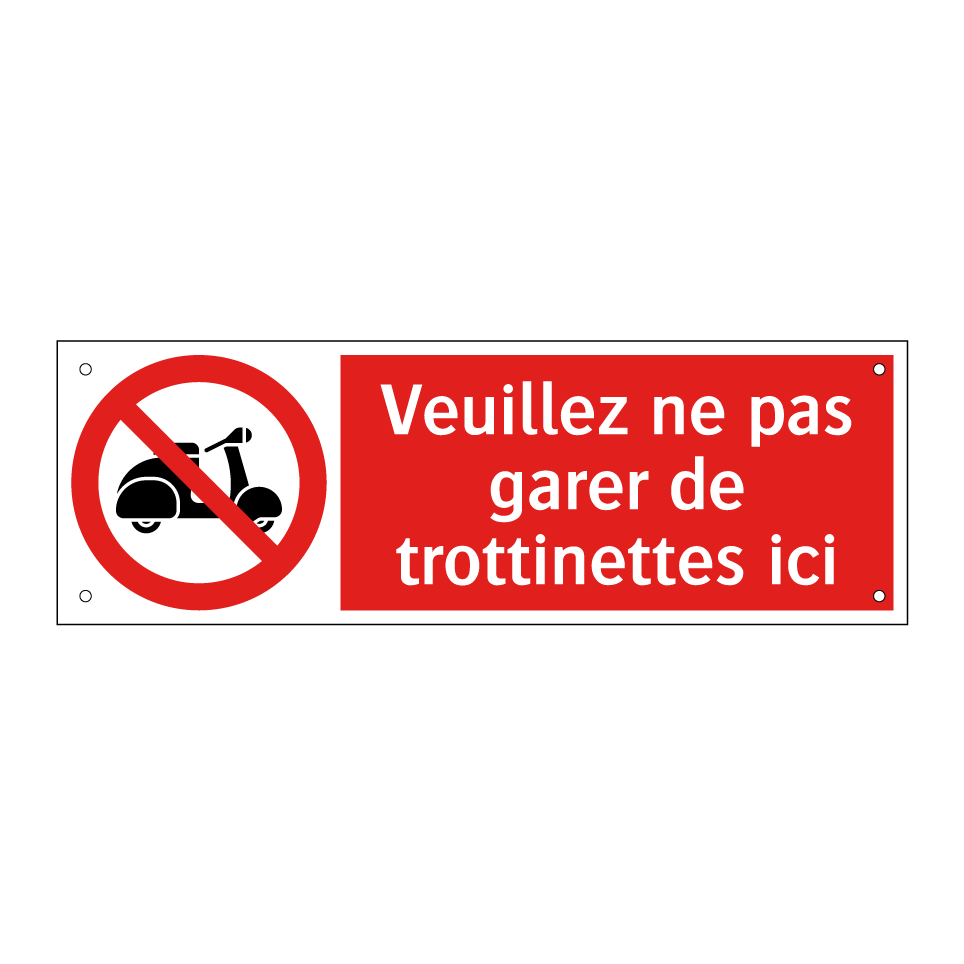 Panneau d'interdiction avec le texte : "Veuillez ne pas garer de trottinettes ici" et une symbolique claire.