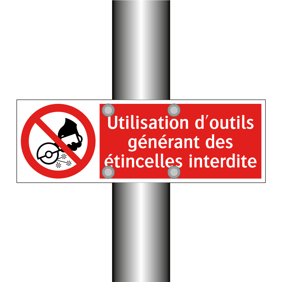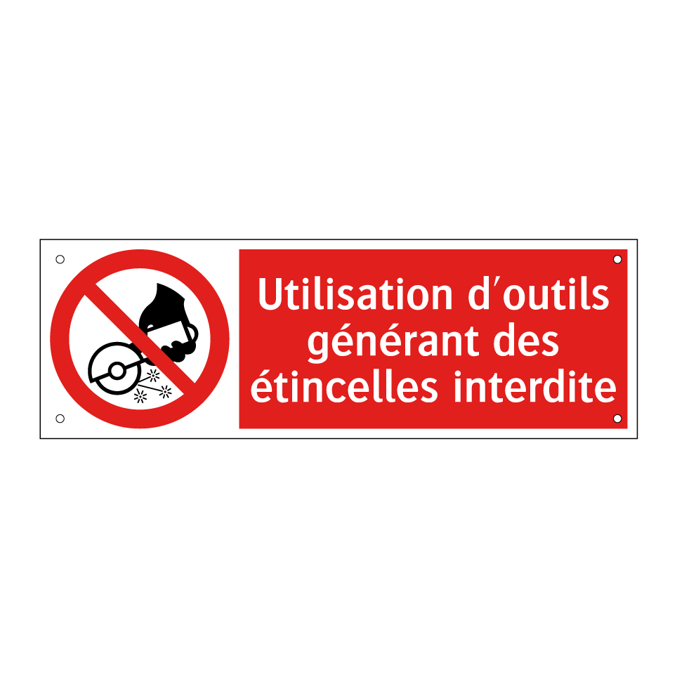 Panneau d'interdiction avec le texte : "Utilisation d'outils générant des étincelles interdite" et une symbolique claire.