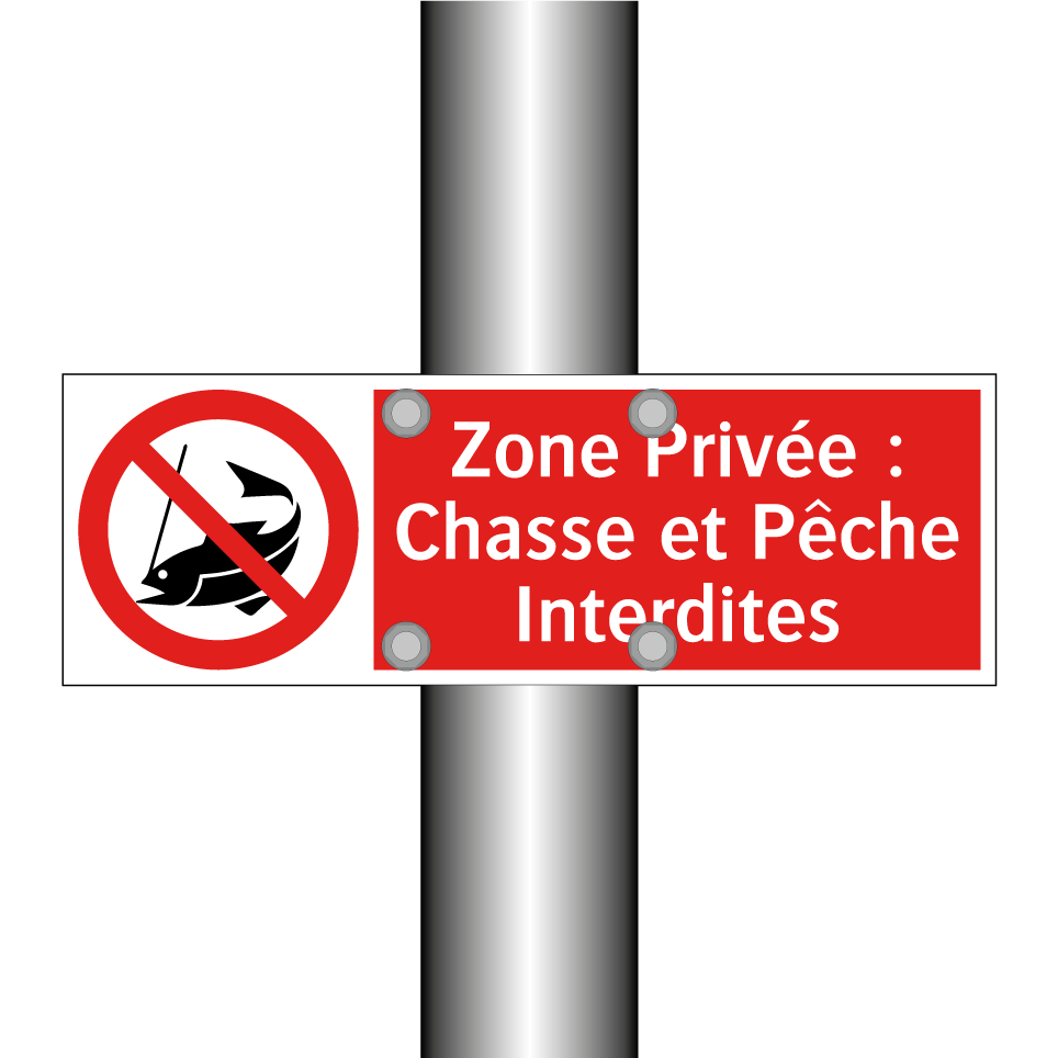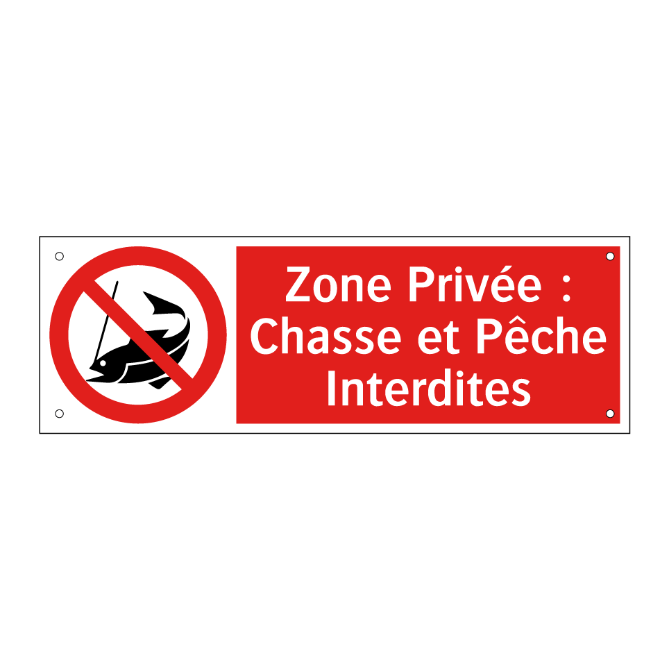 Panneau d'interdiction avec le texte : "Zone Privée : Chasse et Pêche Interdites" et une symbolique claire.