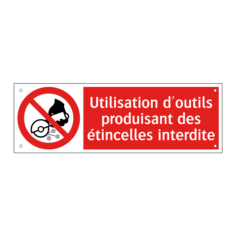 Panneau d'interdiction avec le texte : "Utilisation d'outils produisant des étincelles interdite" et une symbolique claire.
