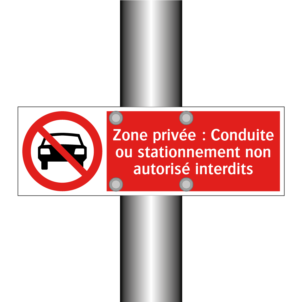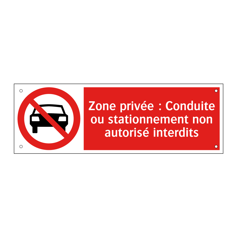 Panneau d'interdiction avec le texte : "Zone privée : Conduite ou stationnement non autorisé interdits" et une symbolique claire.