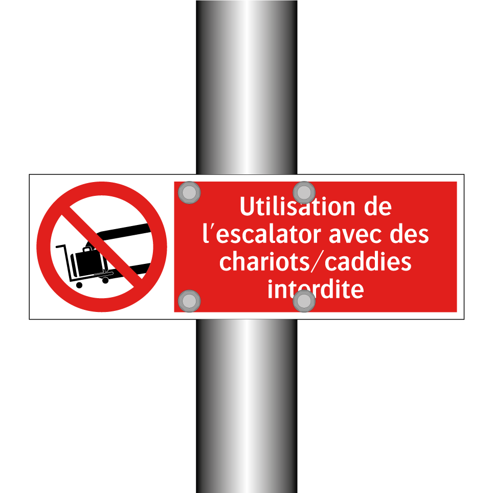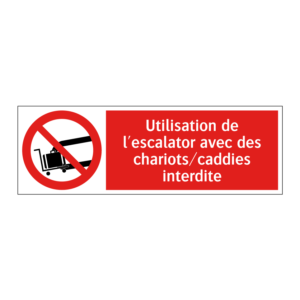 Panneau d'interdiction avec le texte : "Utilisation de l'escalator avec des chariots/caddies interdite" et une symbolique claire.