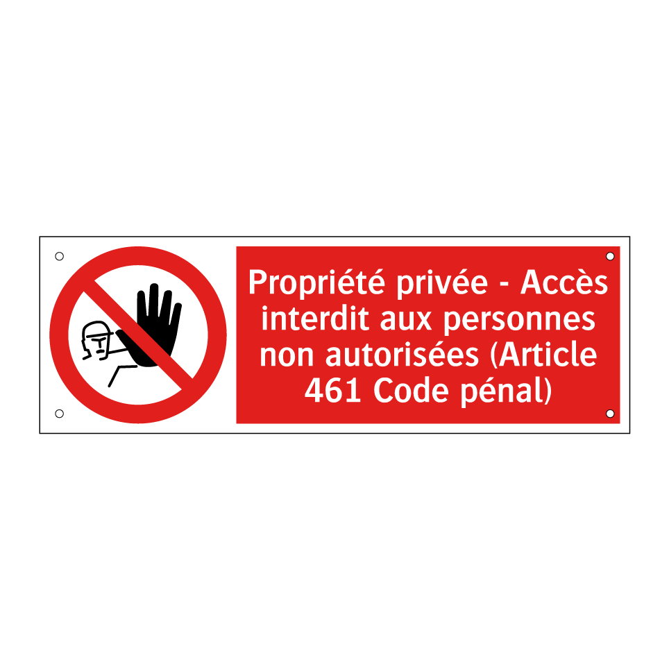 Panneau d'interdiction avec le texte : "Propriété privée - Accès interdit aux personnes non autorisées (Article 461 Code pénal)" et une symbolique claire.