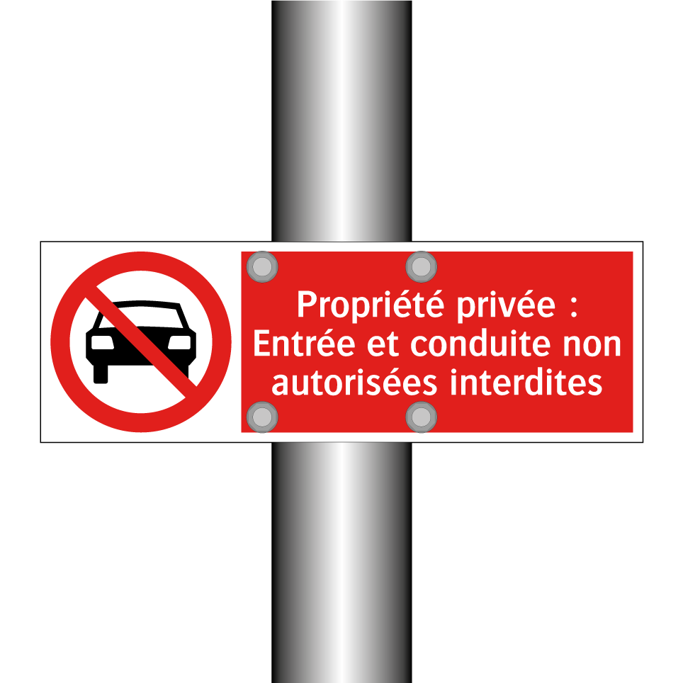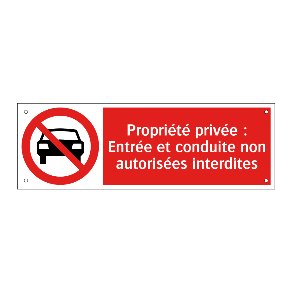 Panneau d'interdiction avec le texte : "Propriété privée : Entrée et conduite non autorisées interdites" et une symbolique claire.