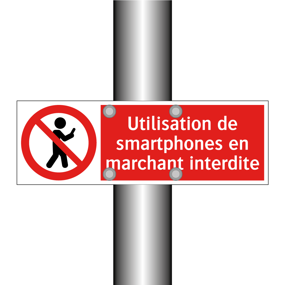 Panneau d'interdiction avec le texte : "Utilisation de smartphones en marchant interdite" et une symbolique claire.