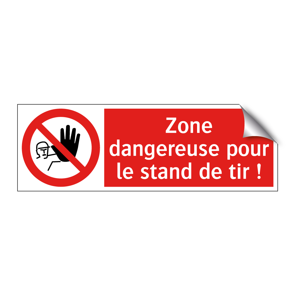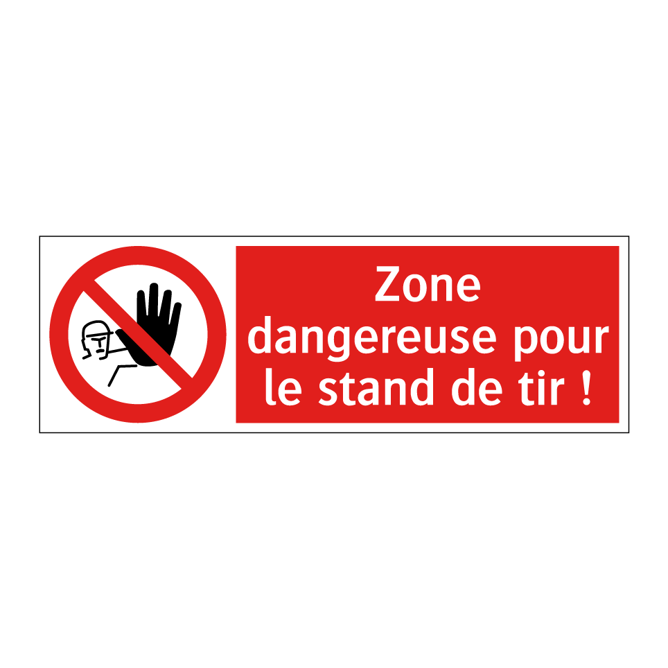 Panneau d'interdiction avec le texte : "Zone dangereuse pour le stand de tir !" et une symbolique claire.