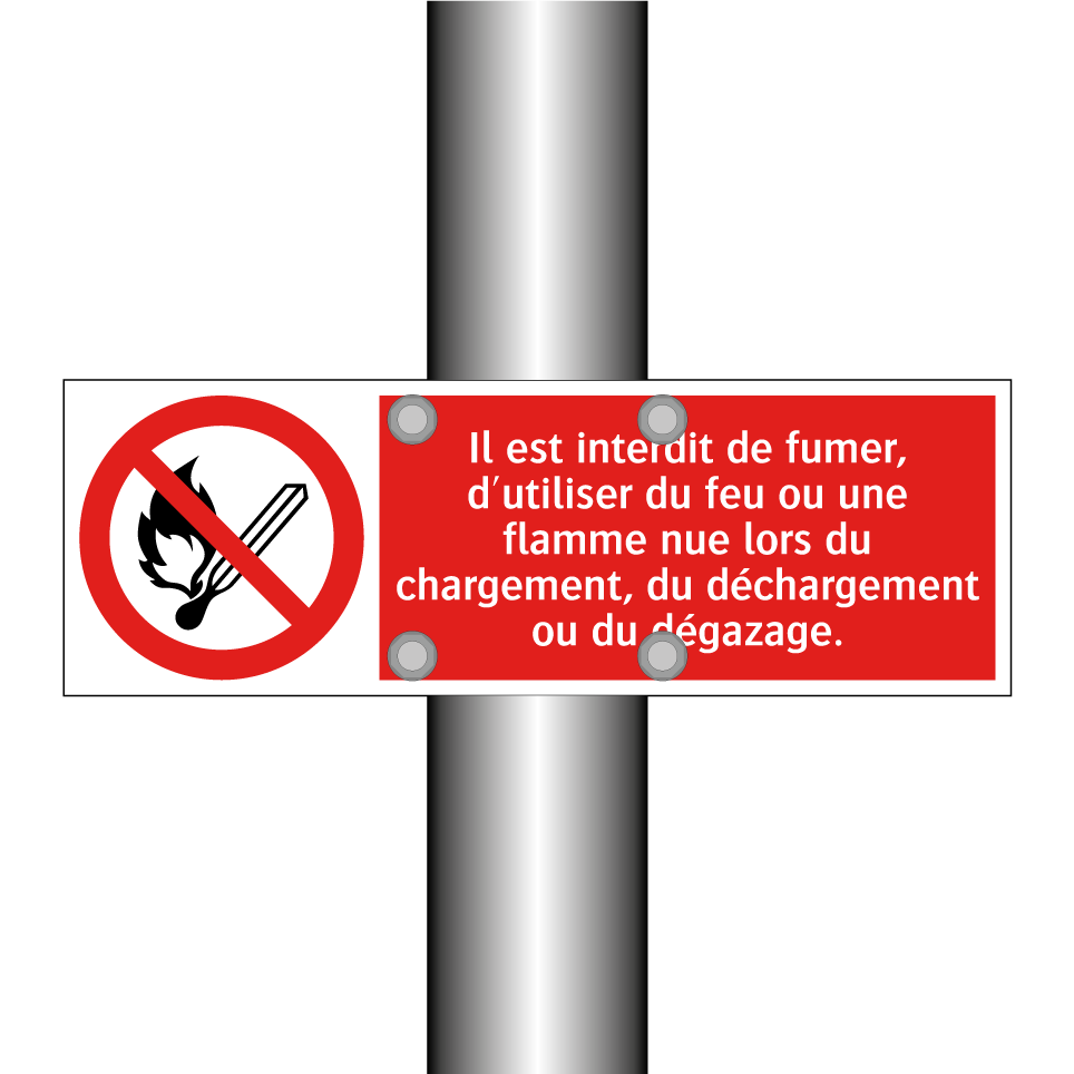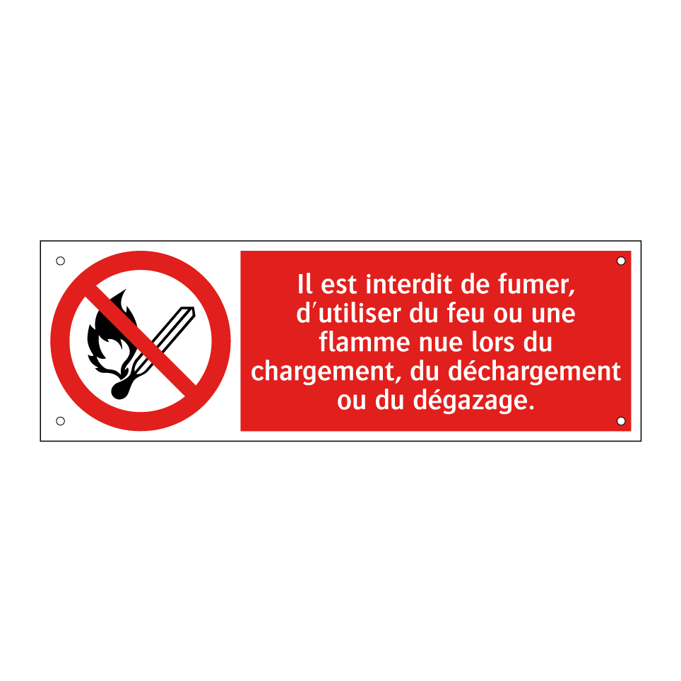 Panneau d'interdiction avec le texte : "Il est interdit de fumer, d'utiliser du feu ou une flamme nue lors du chargement, du déchargement ou du dégazage." et une symbolique claire.