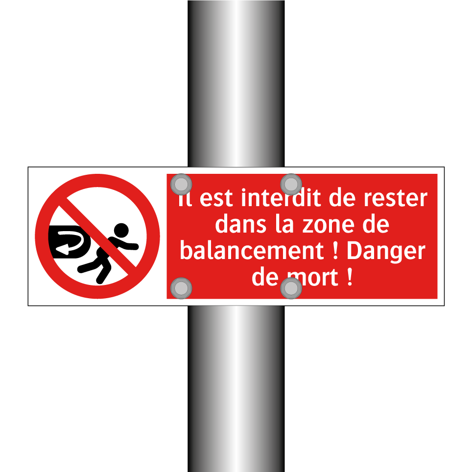 Panneau d'interdiction avec le texte : "Il est interdit de rester dans la zone de balancement ! Danger de mort !" et une symbolique claire.