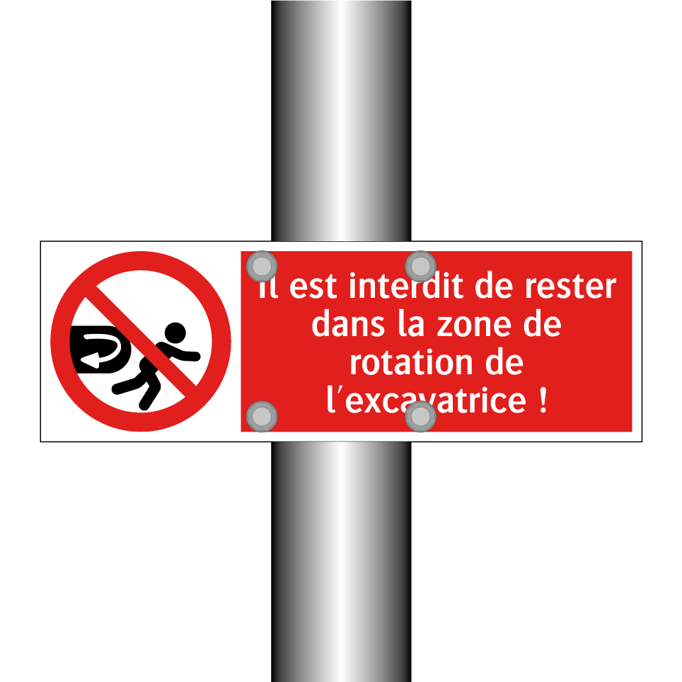 Panneau d'interdiction avec le texte : "Il est interdit de rester dans la zone de rotation de l'excavatrice !" et une symbolique claire.