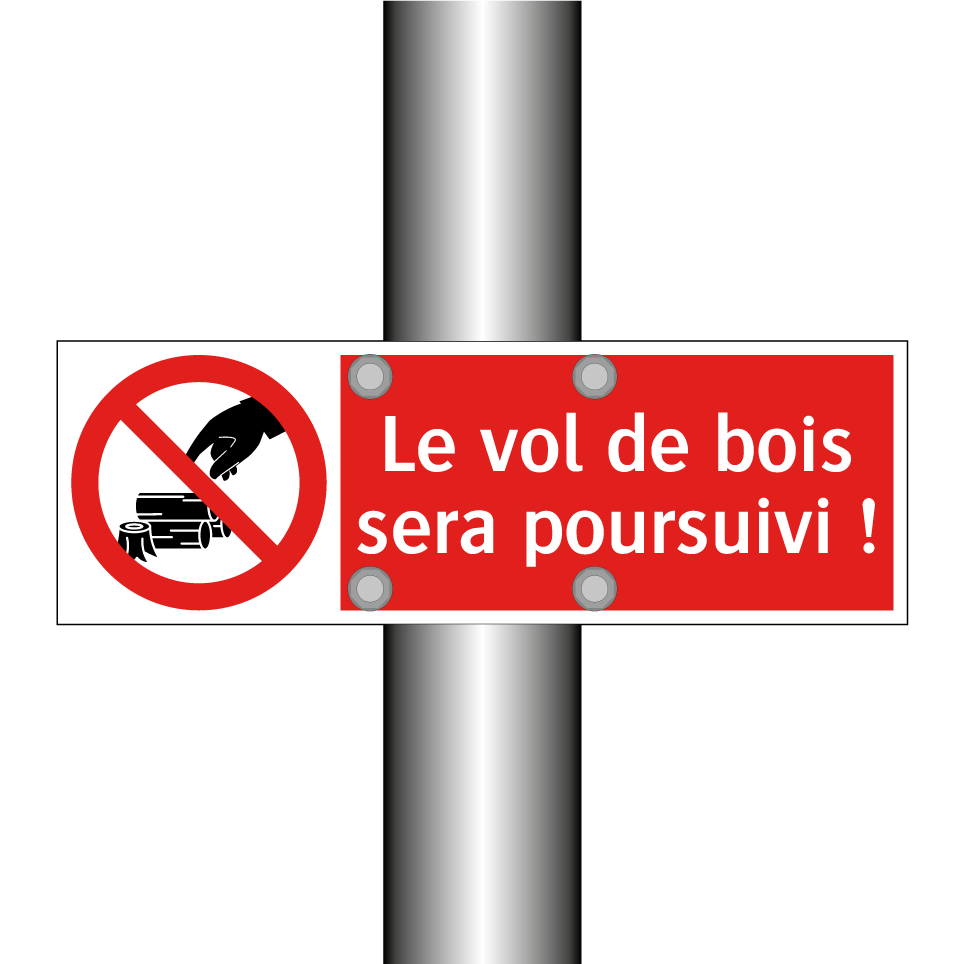 Panneau d'interdiction avec le texte : "Le vol de bois sera poursuivi !" et une symbolique claire.