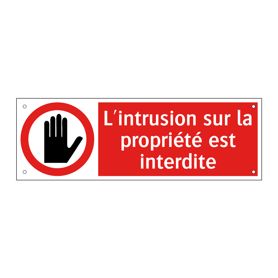 Panneau d'interdiction avec le texte : "L'intrusion sur la propriété est interdite" et une symbolique claire.