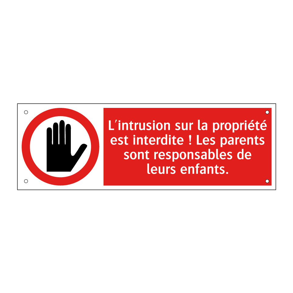 Panneau d'interdiction avec le texte : "L'intrusion sur la propriété est interdite ! Les parents sont responsables de leurs enfants." et une symbolique claire.