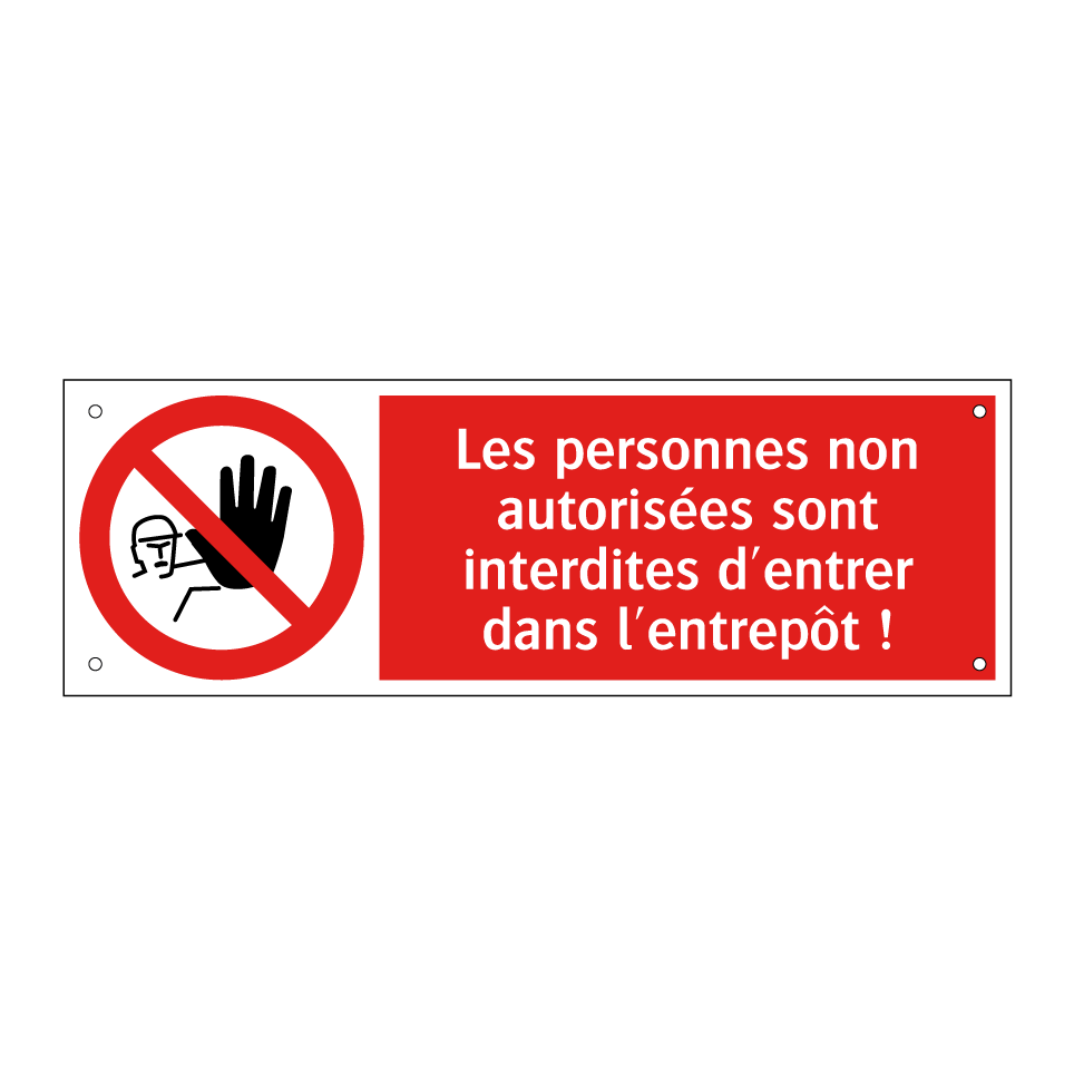 Panneau d'interdiction avec le texte : "Les personnes non autorisées sont interdites d'entrer dans l'entrepôt !" et une symbolique claire.