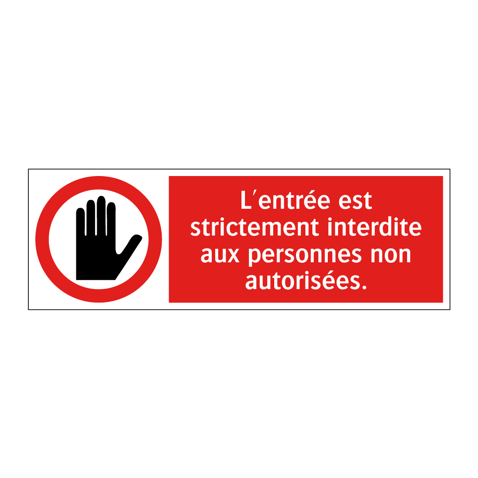 Panneau d'interdiction avec le texte : "L'entrée est strictement interdite aux personnes non autorisées." et une symbolique claire.