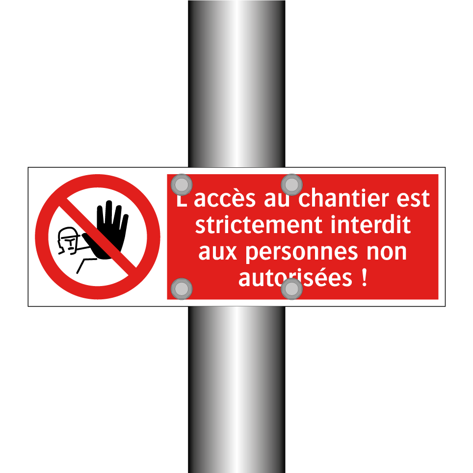 Panneau d'interdiction avec le texte : "L'accès au chantier est strictement interdit aux personnes non autorisées !" et une symbolique claire.