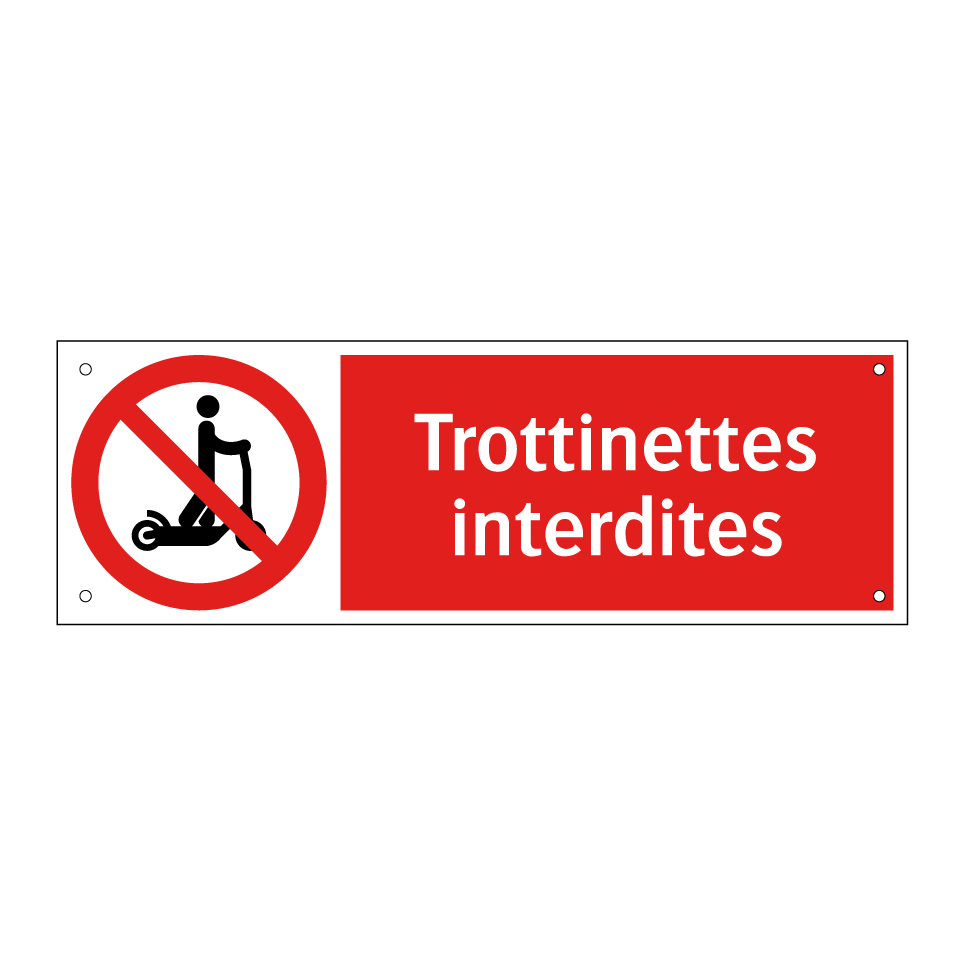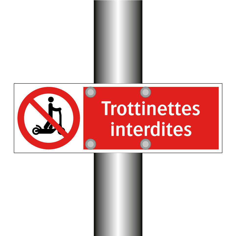 Panneau d'interdiction avec le texte : "Trottinettes interdites" et une symbolique claire.