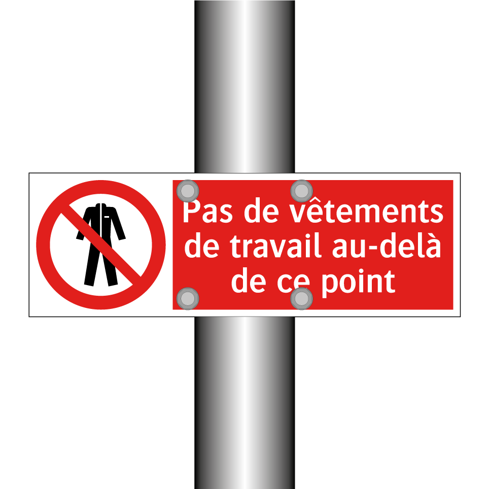 Panneau d'interdiction avec le texte : "Pas de vêtements de travail au-delà de ce point" et une symbolique claire.
