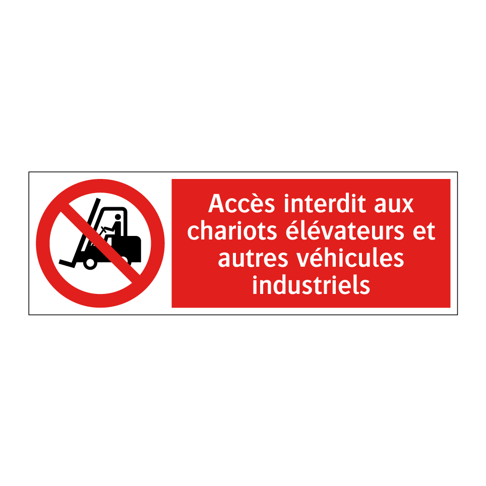 Panneau d'interdiction avec le texte : "Accès interdit aux chariots élévateurs et autres véhicules industriels" et une symbolique claire.