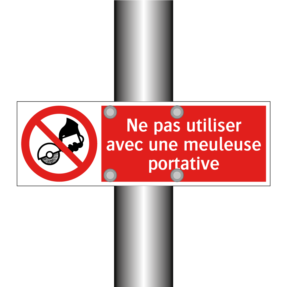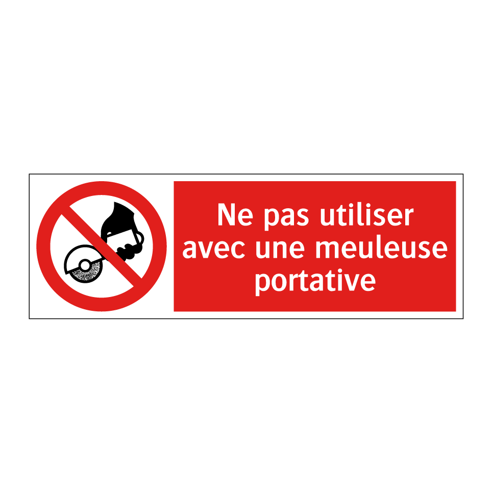 Panneau d'interdiction avec le texte : "Ne pas utiliser avec une meuleuse portative" et une symbolique claire.