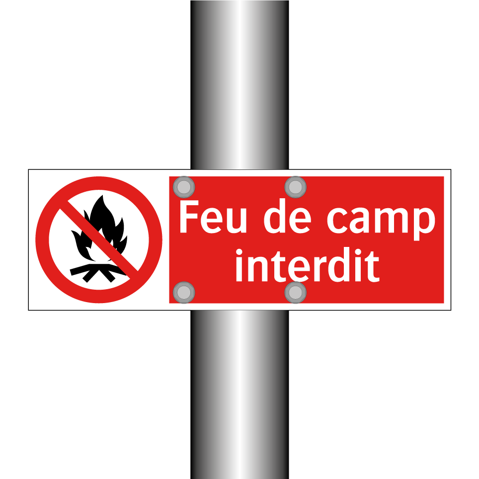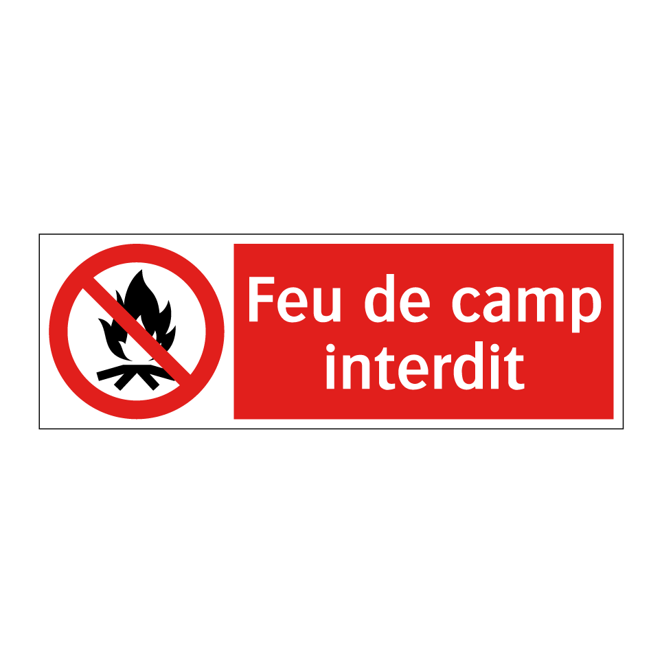 Panneau d'interdiction avec le texte : "Feu de camp interdit" et une symbolique claire.