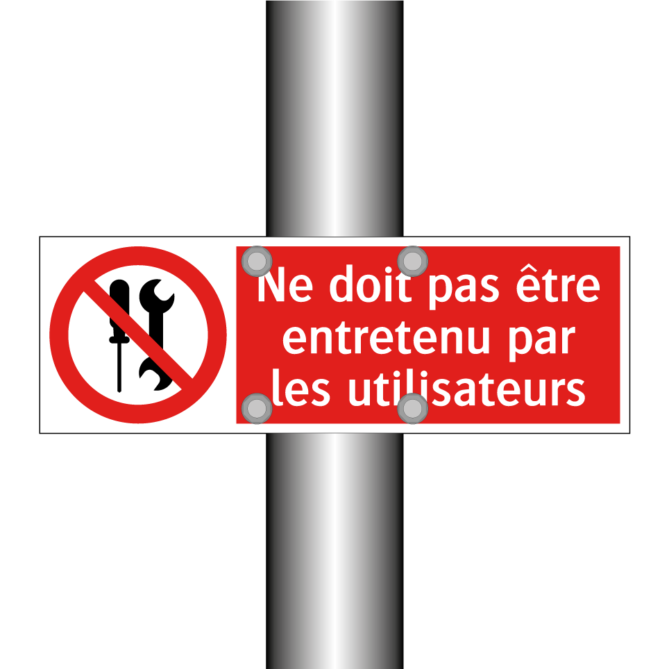 Panneau d'interdiction avec le texte : "Ne doit pas être entretenu par les utilisateurs" et une symbolique claire.
