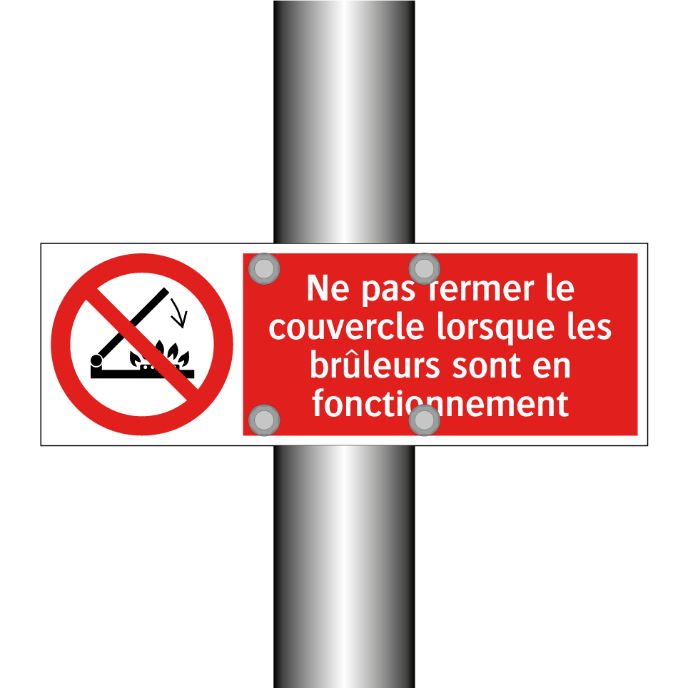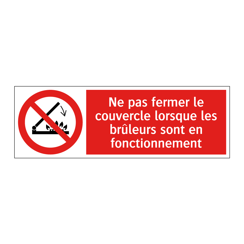 Panneau d'interdiction avec le texte : "Ne pas fermer le couvercle lorsque les brûleurs sont en fonctionnement" et une symbolique claire.