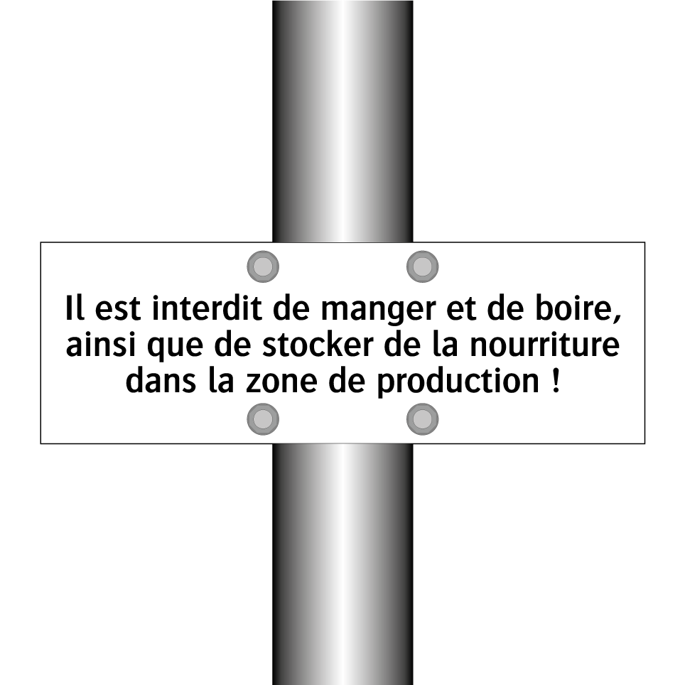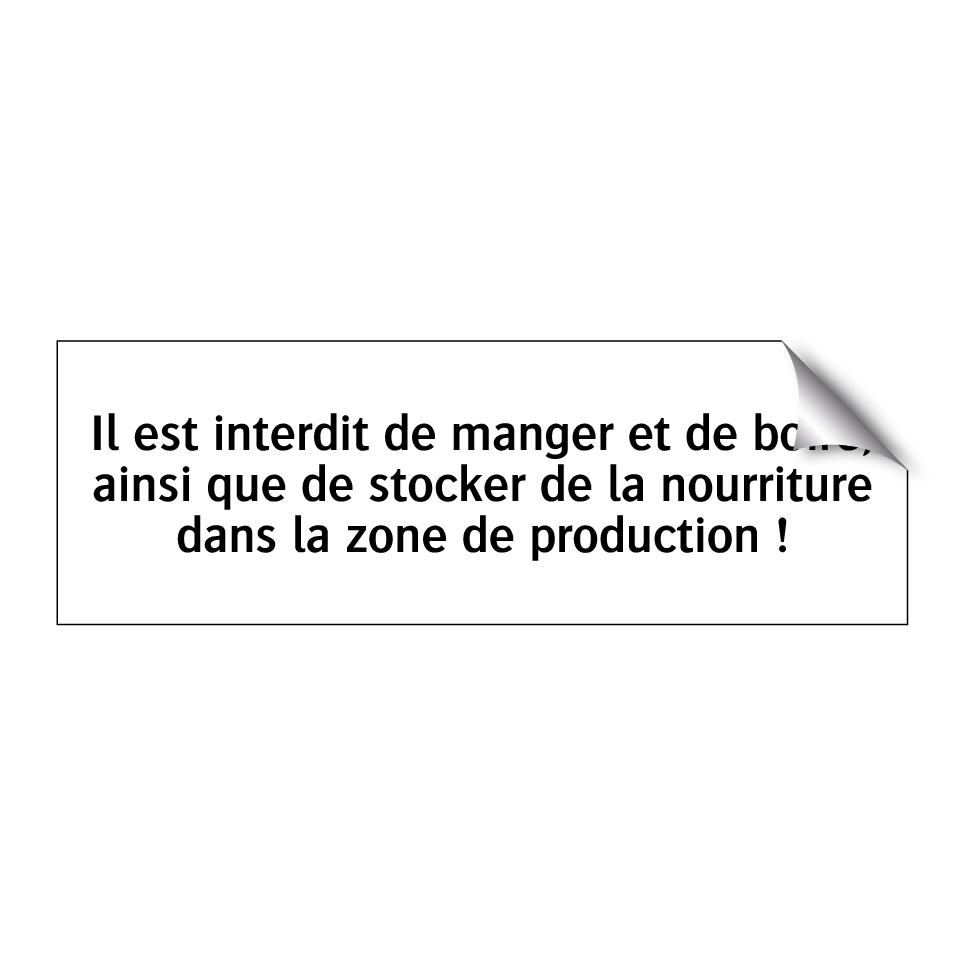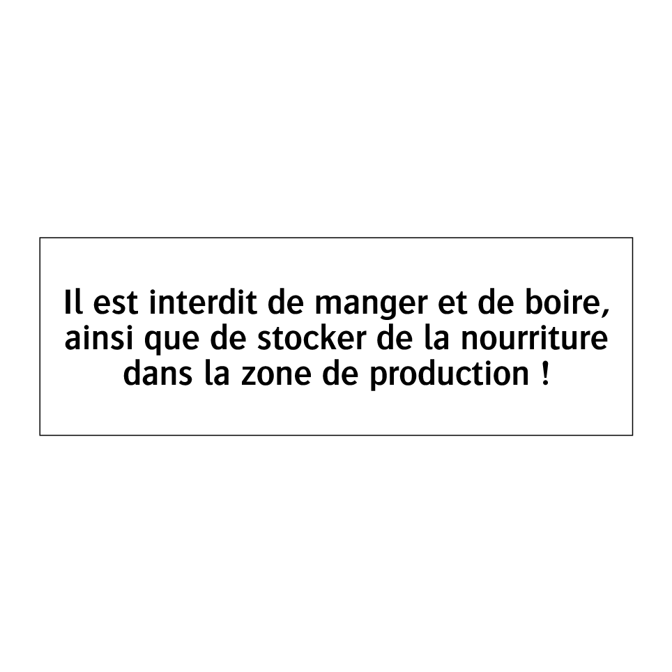 Panneau d'interdiction avec le texte : "Il est interdit de manger et de boire, ainsi que de stocker de la nourriture dans la zone de production !"